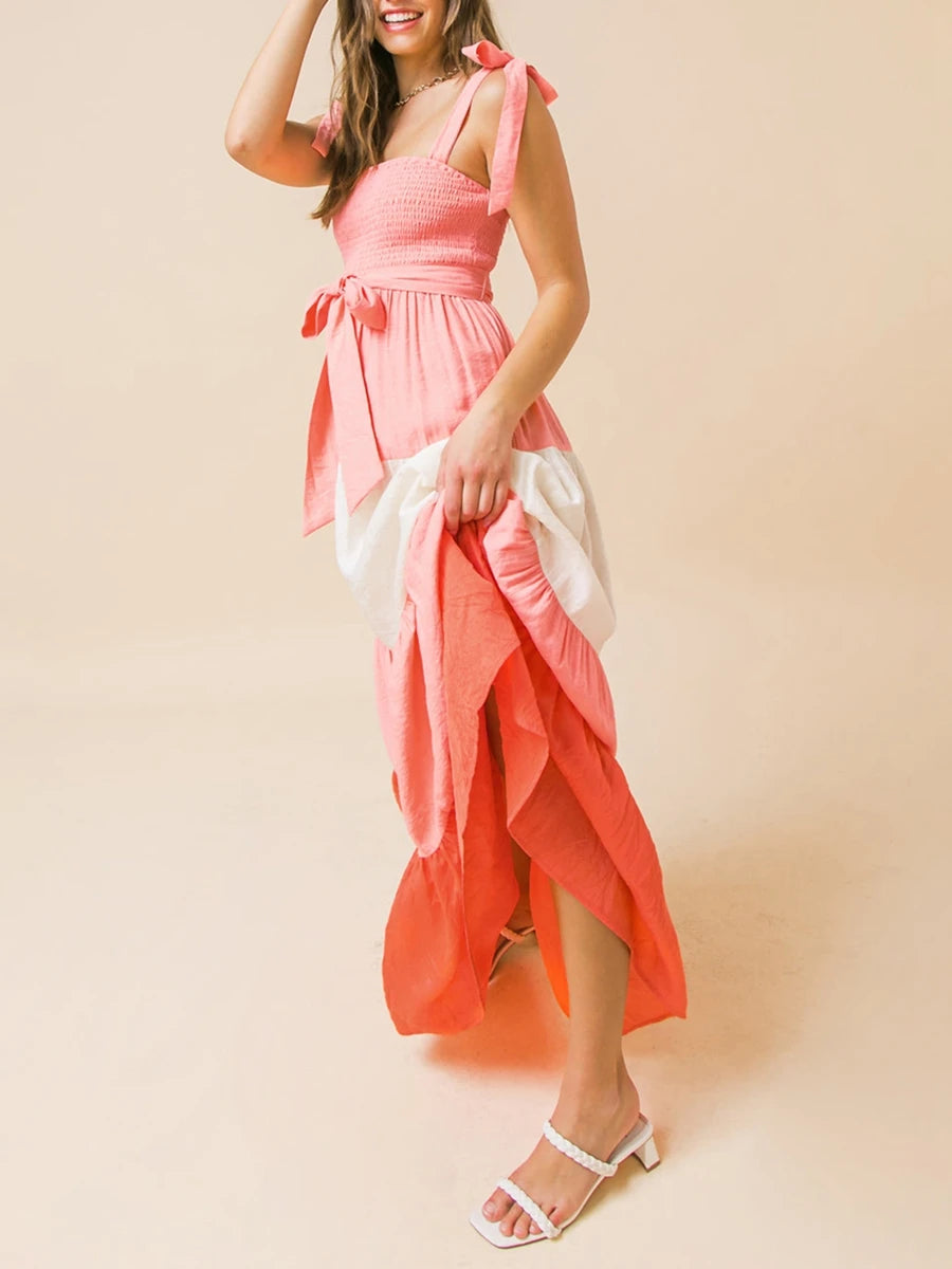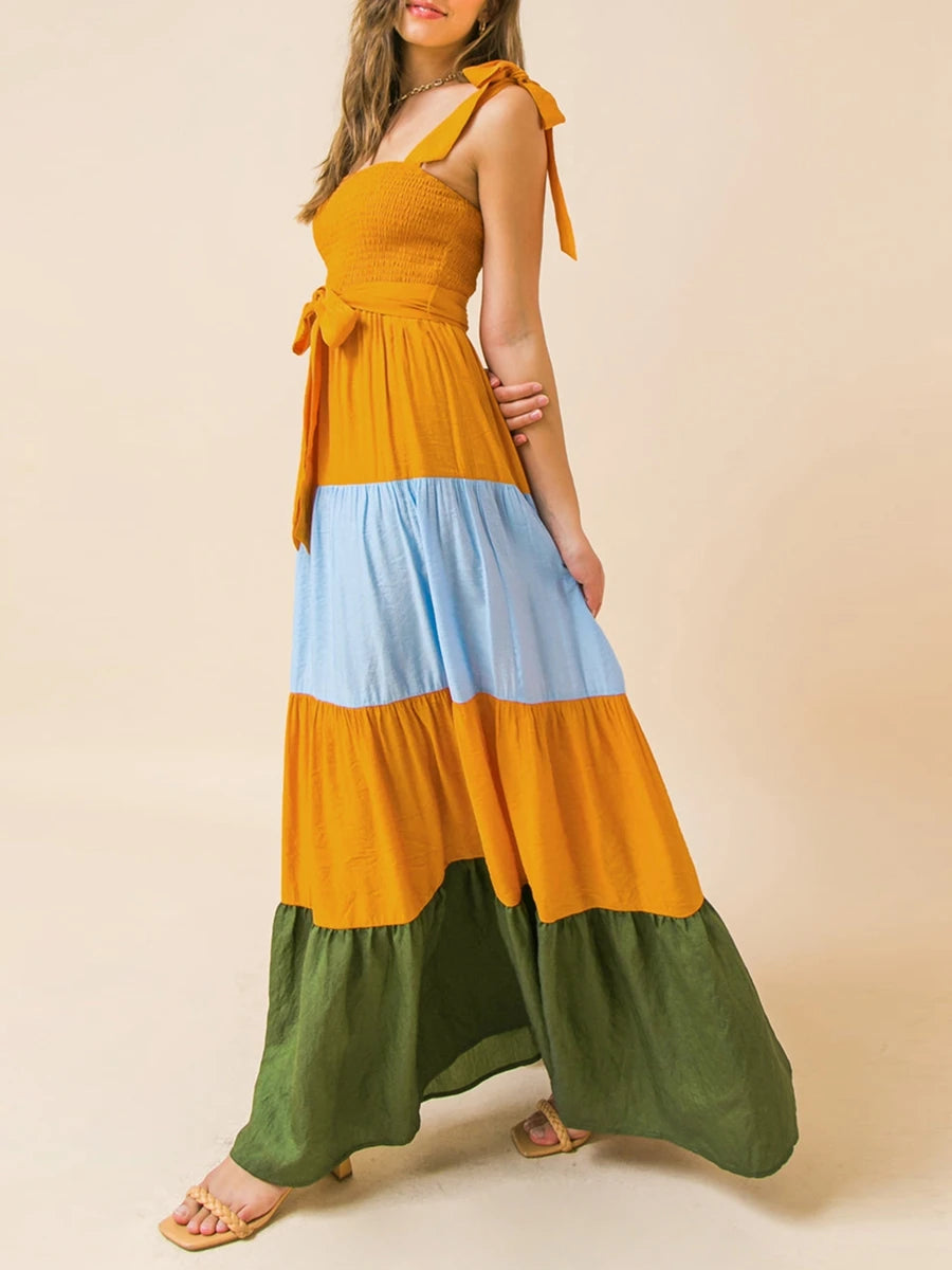 Womens Tie Shoulder Dress Summer Sleeveless Contrast Color A-Line Dress Long Flowy Dress