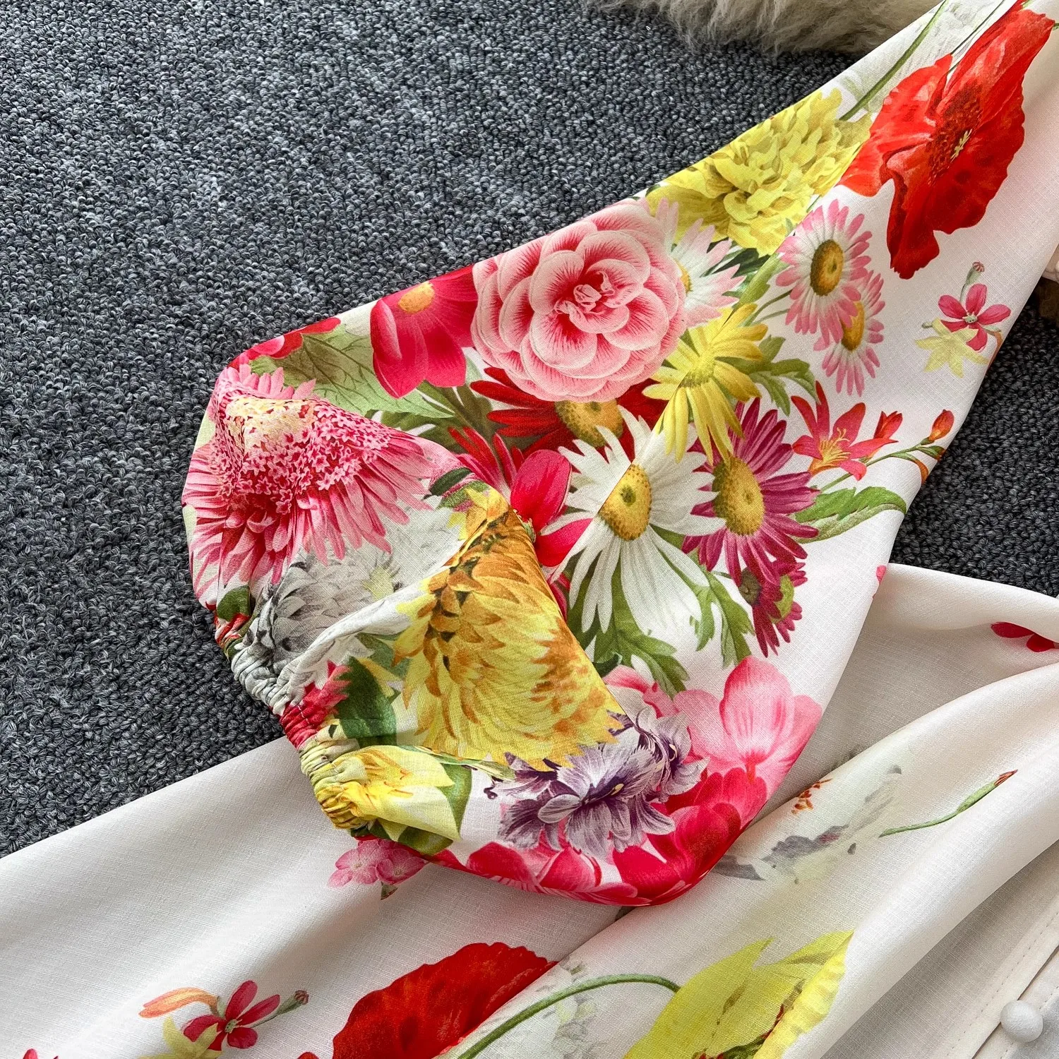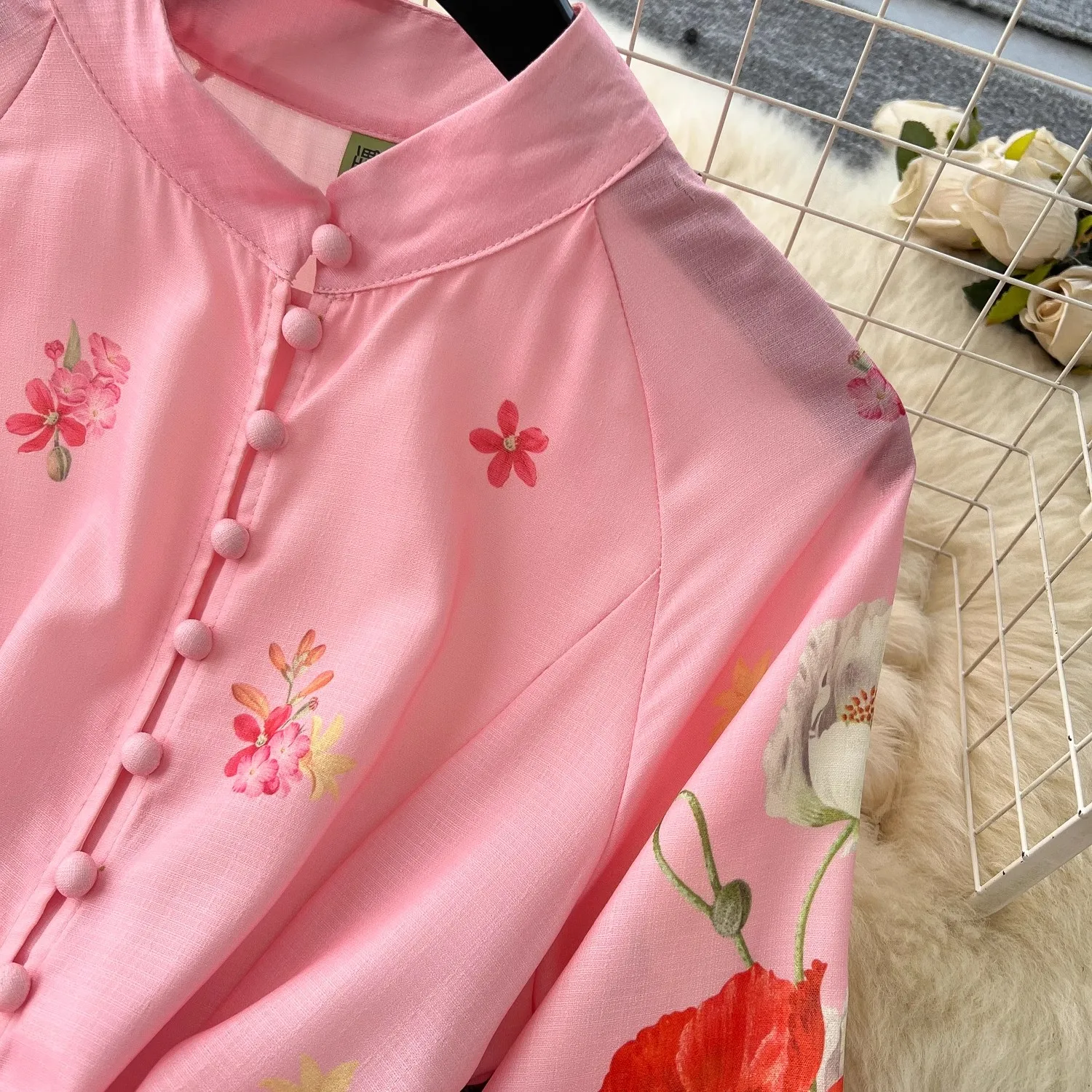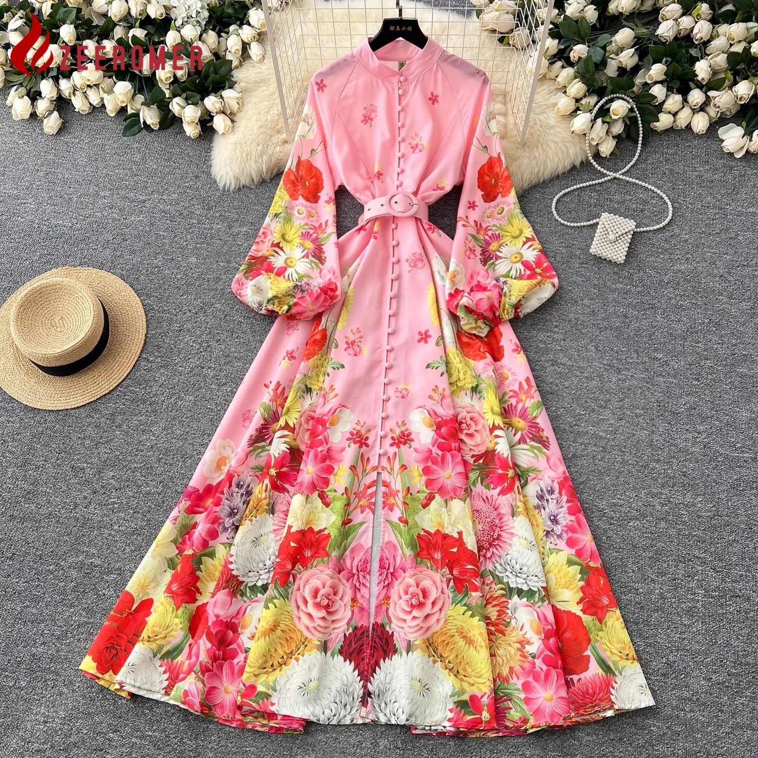 🍒Floral print maxi dress puff sleeve pattern womens stand collar outfit with flowers belt single breasted shirt dress gorgeous prom party wear occasion fashion wedding guest clothes Get Pink Lemonade At A Garden Party