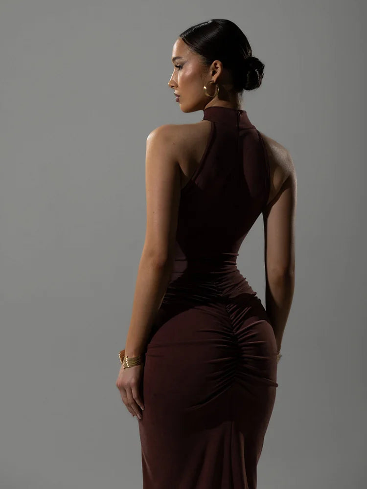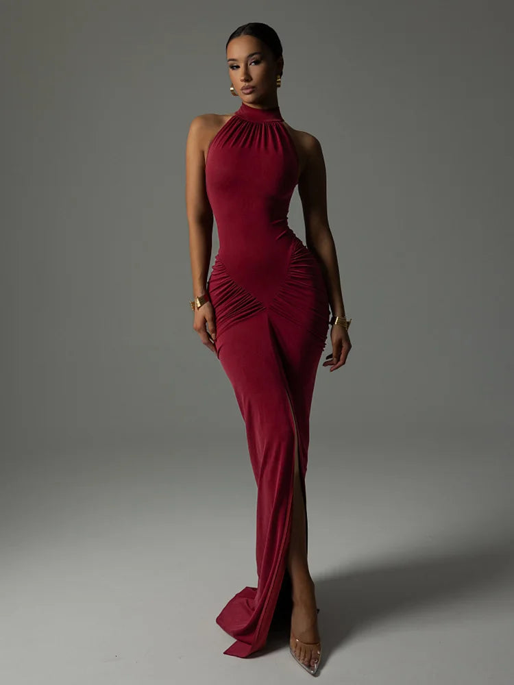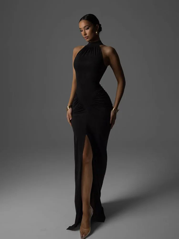🍒Ahagaga Party Women's Maxi Dresses Sexy Solid Turtleneck Halter Sheath Folds Fashion Split Slim Fit Bodyson Sleeveless Vestidos