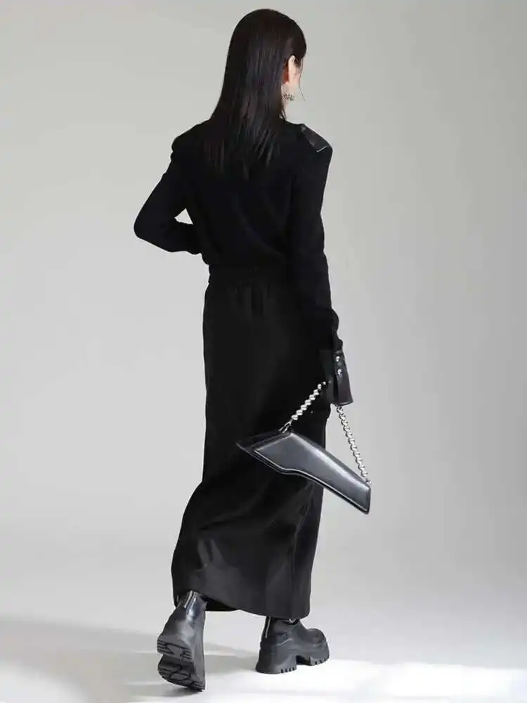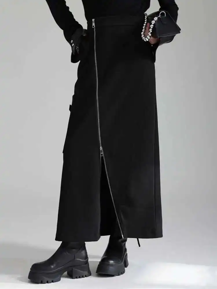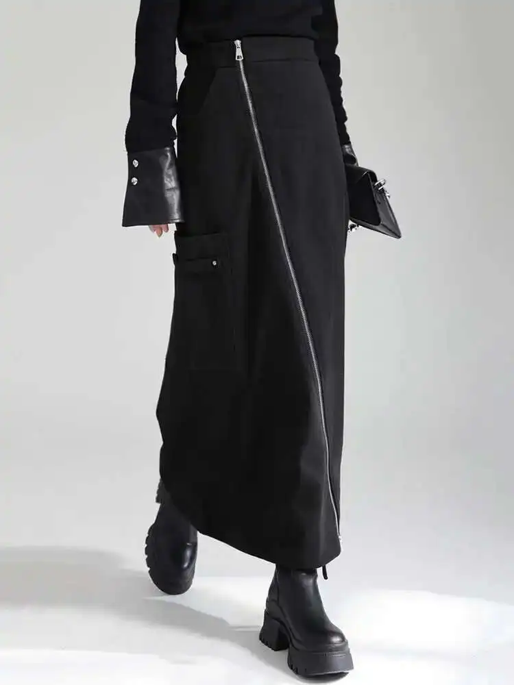 🍒High waist irregular long skirt black with slit zipper and pocket midi fashion long smart casual clothing for women party occasion wear Zip This Up And Look Lovely In Liquorise