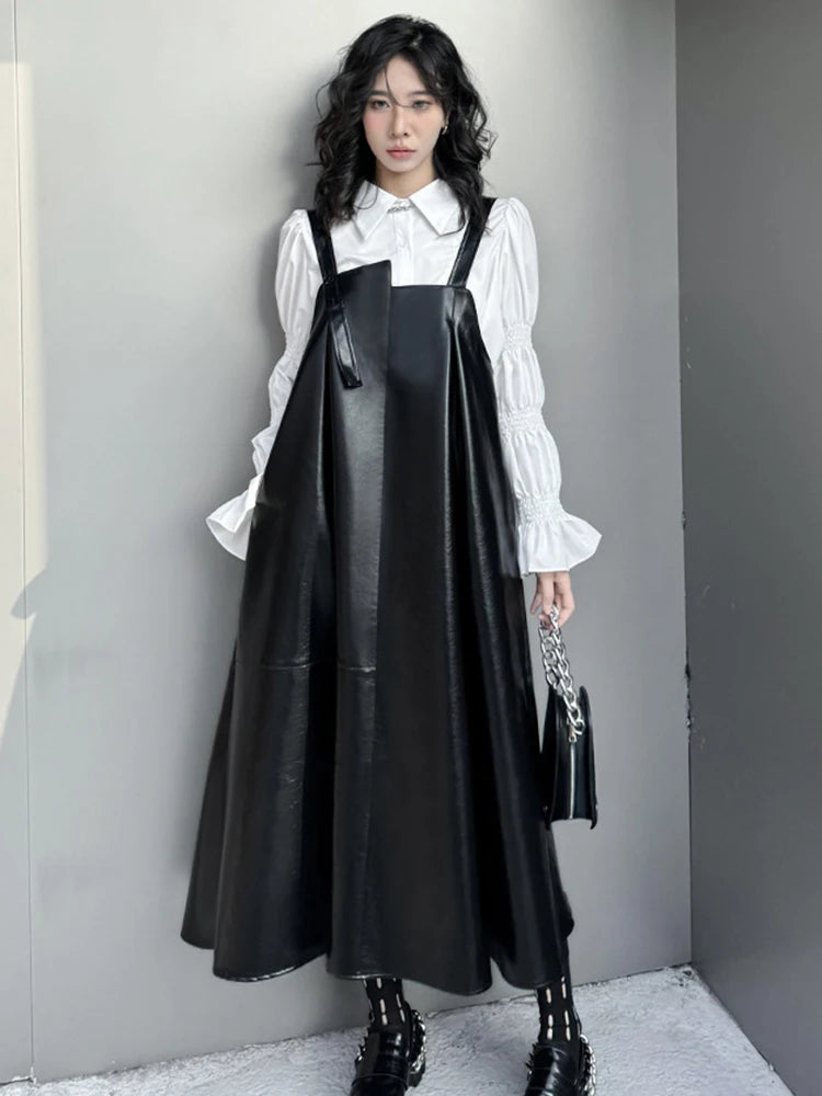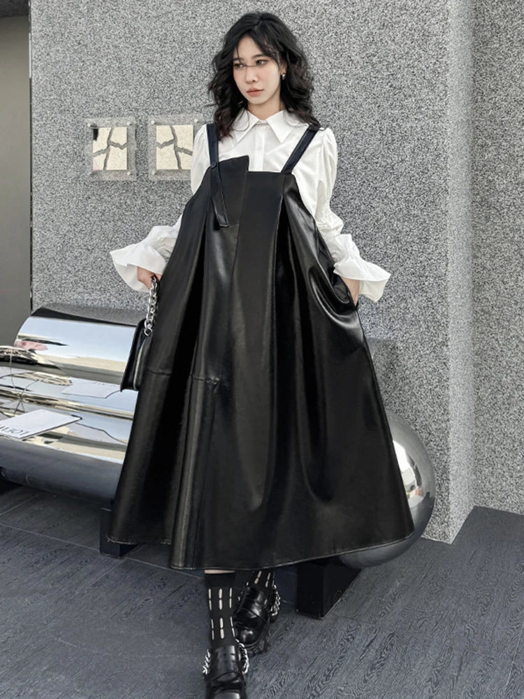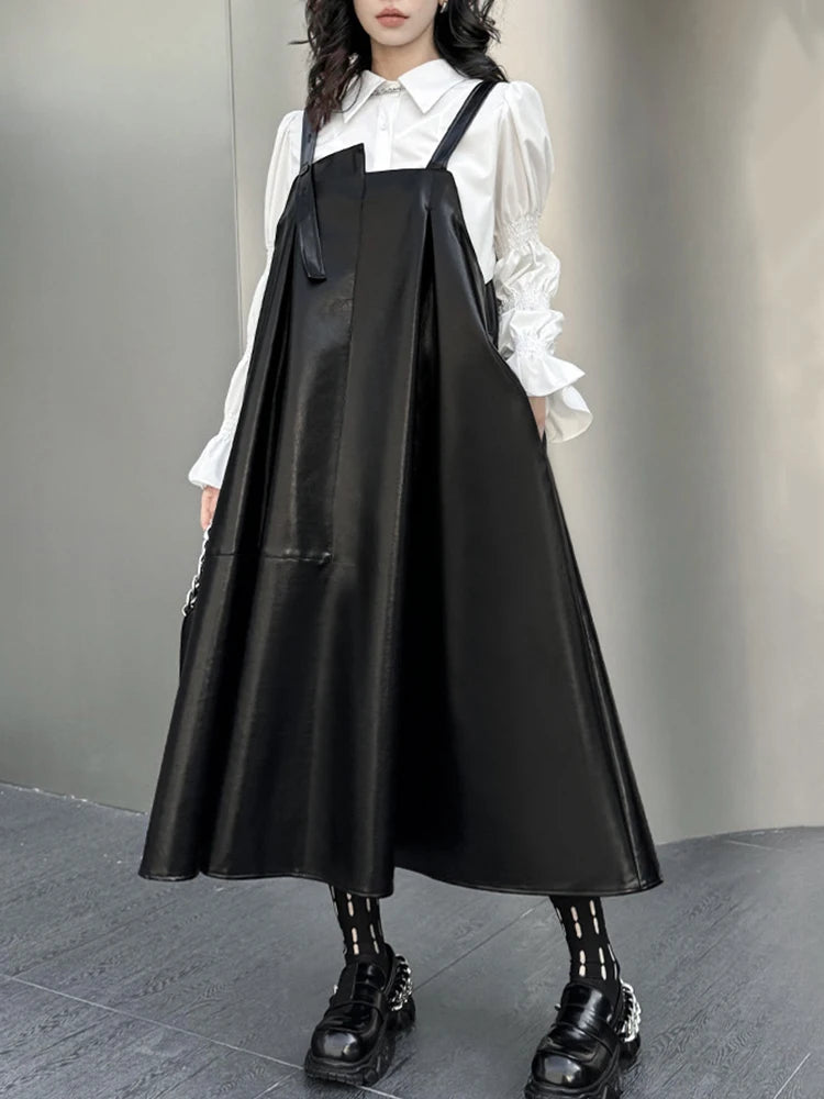 🍒Black faux leather dress big swing size midi spaghetti strap square neck outfit pu shiny with seeveless occasion party wear clothing smart casual women Black Swirly Pearl