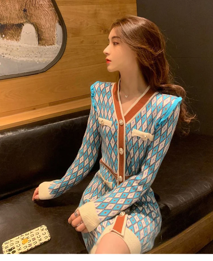 🍒Knitted dress for women v- neck autumn winter fashion french style clothing smart casual female outfit women diamond checkered clothing Playout Plaids