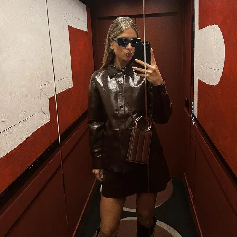 🍒Leather short skirt set women Y2K long sleeve pu jacket and mini skirt suits women's high street fashion smart casual outfits