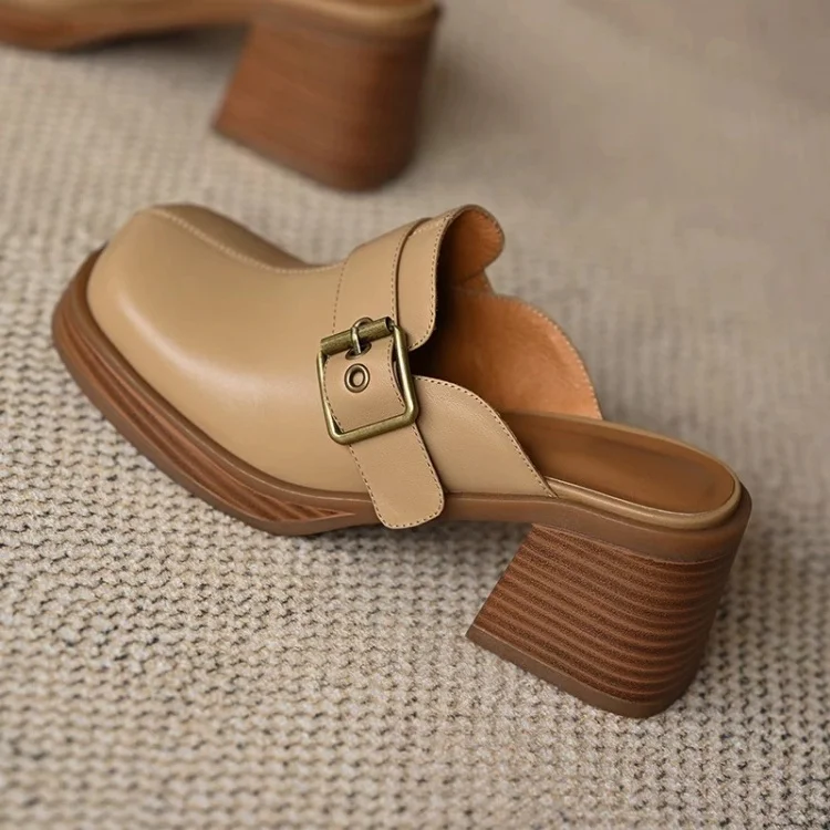 🍒Genuine leather buckle shoe open back mules for ladies smart casual summer footwear commuter thick heel slides