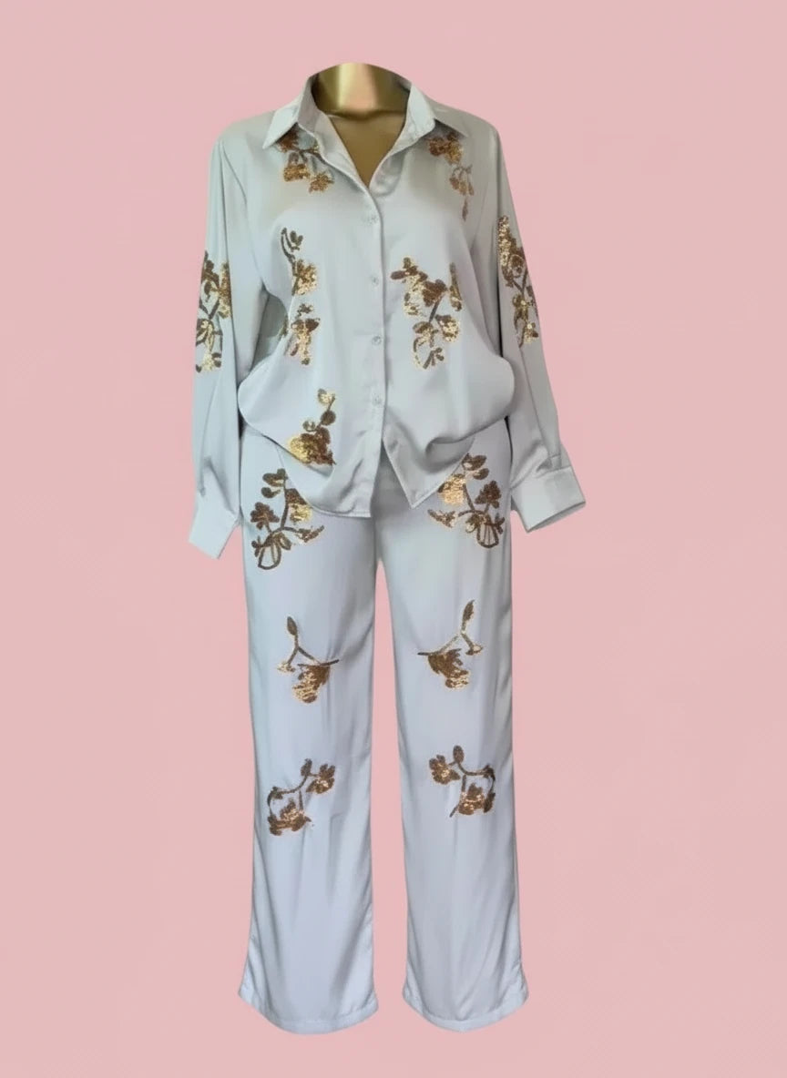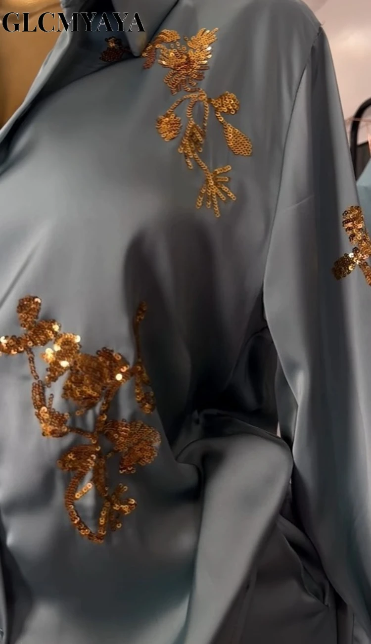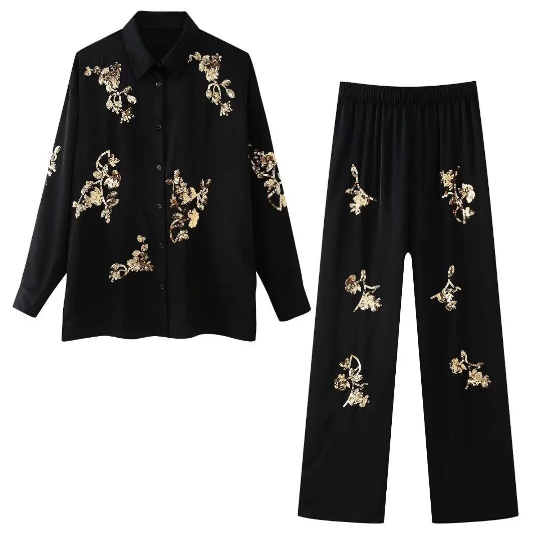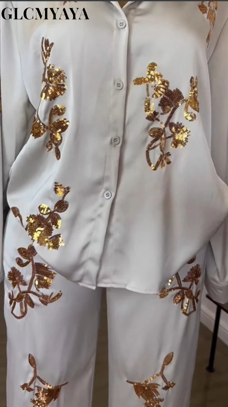 🍒Sequin two piece set long sleeve shirt top with elasticated waist party trousers smart casual clothing occasion outfit for women holiday vacation clothes for beach party Suitable Satin