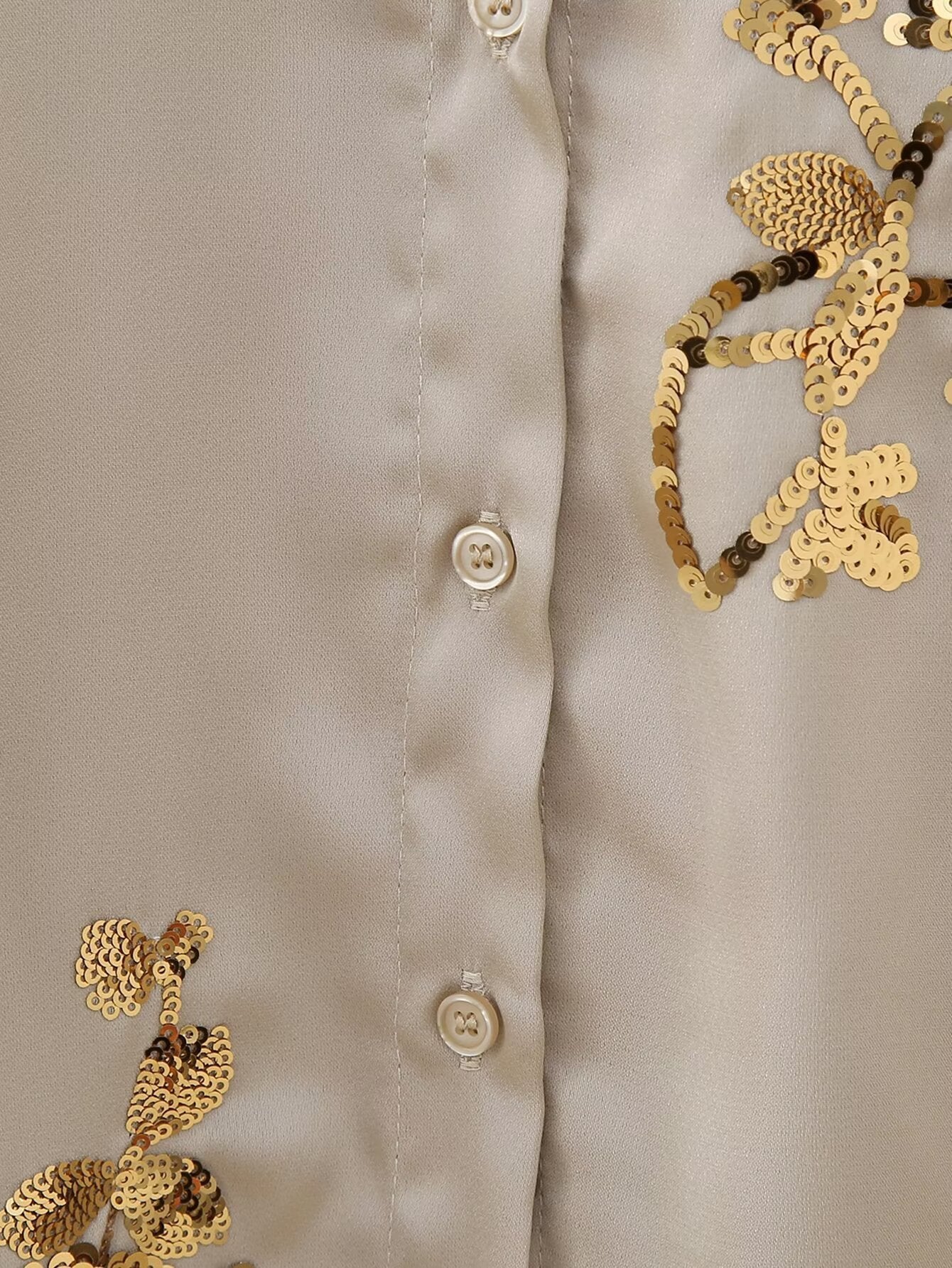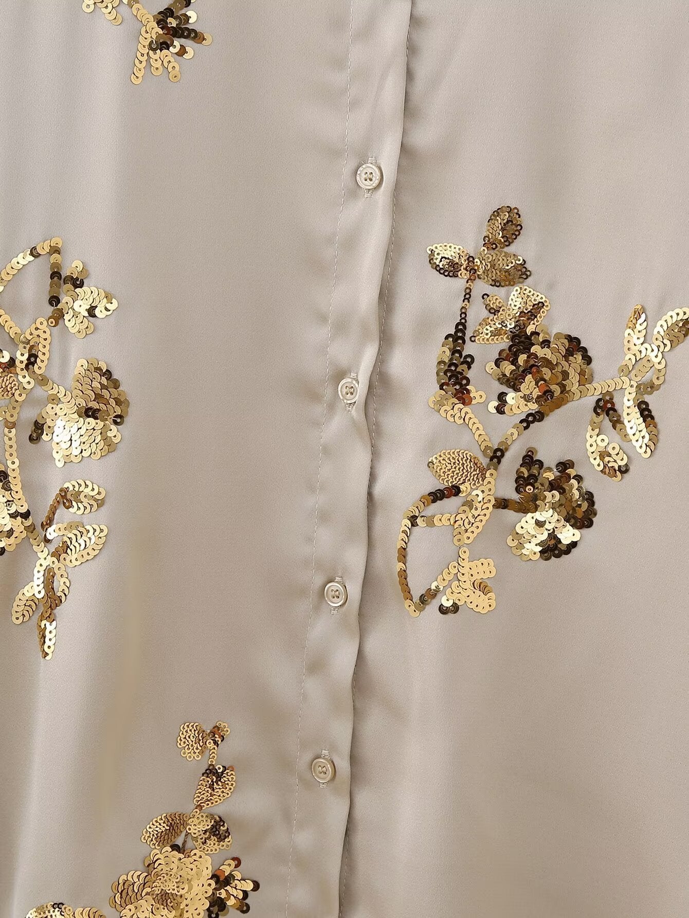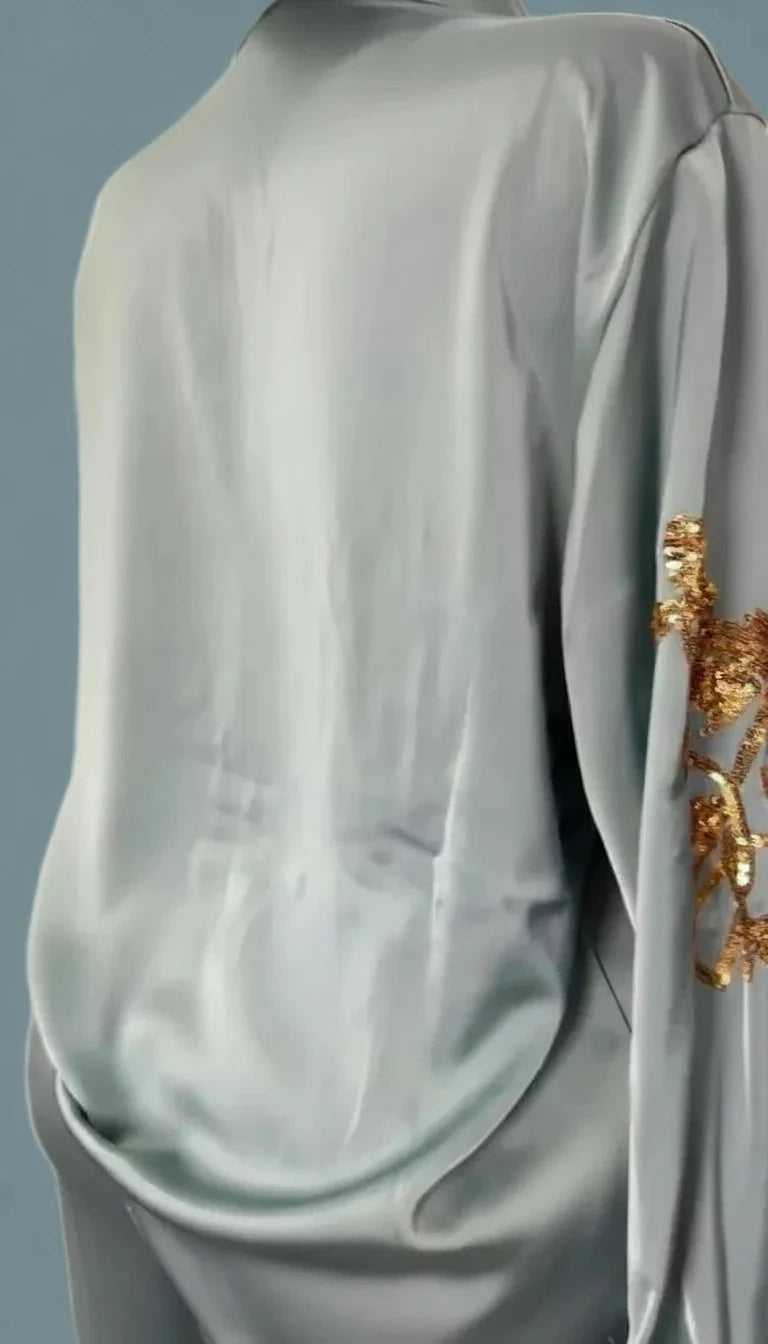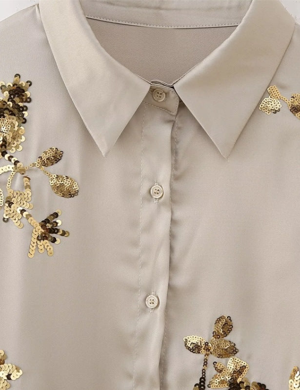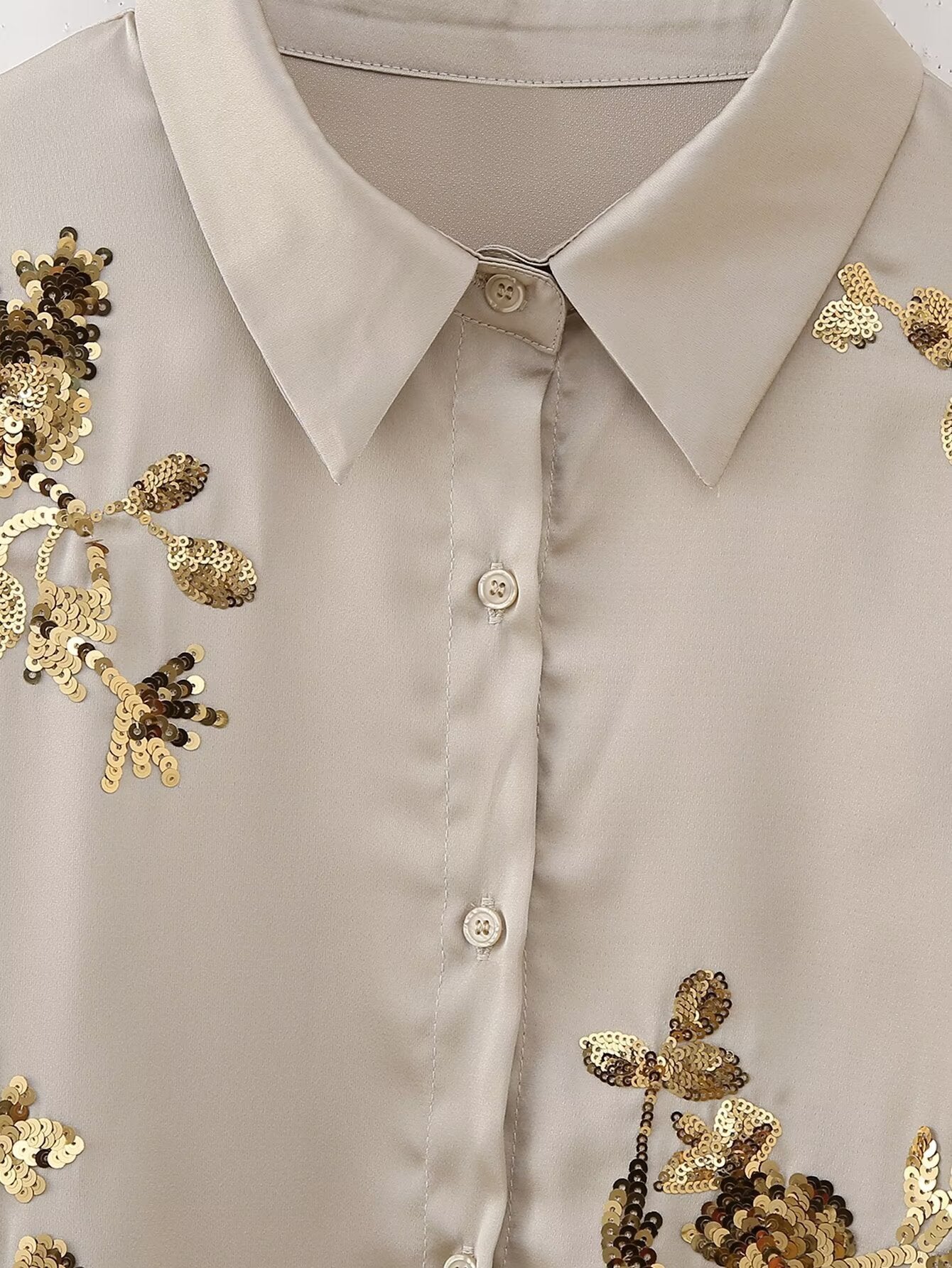 🍒Sequin two piece set long sleeve shirt top with elasticated waist party trousers smart casual clothing occasion outfit for women holiday vacation clothes for beach party Suitable Satin