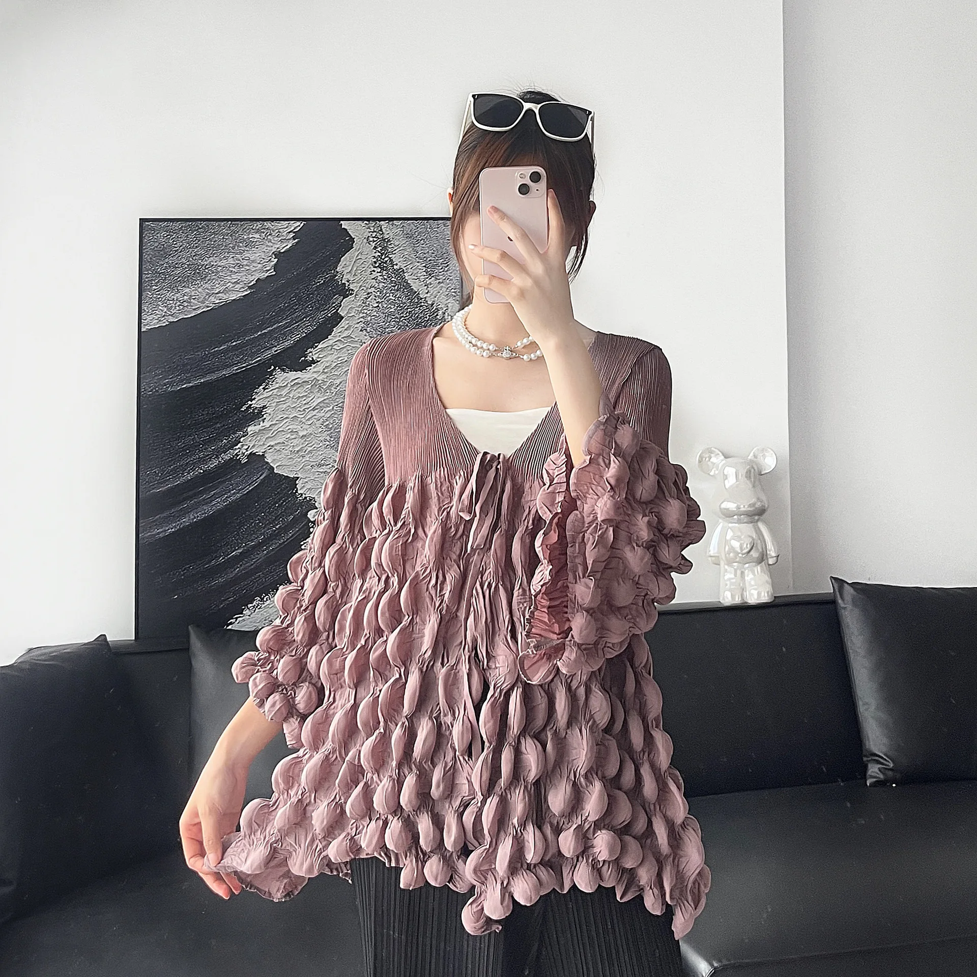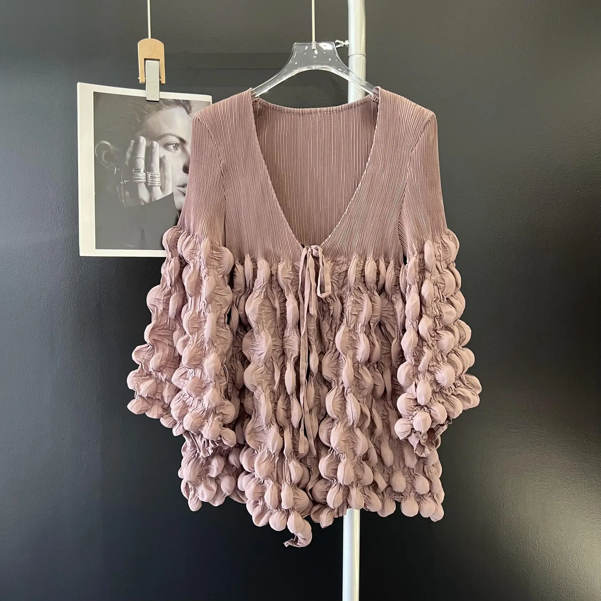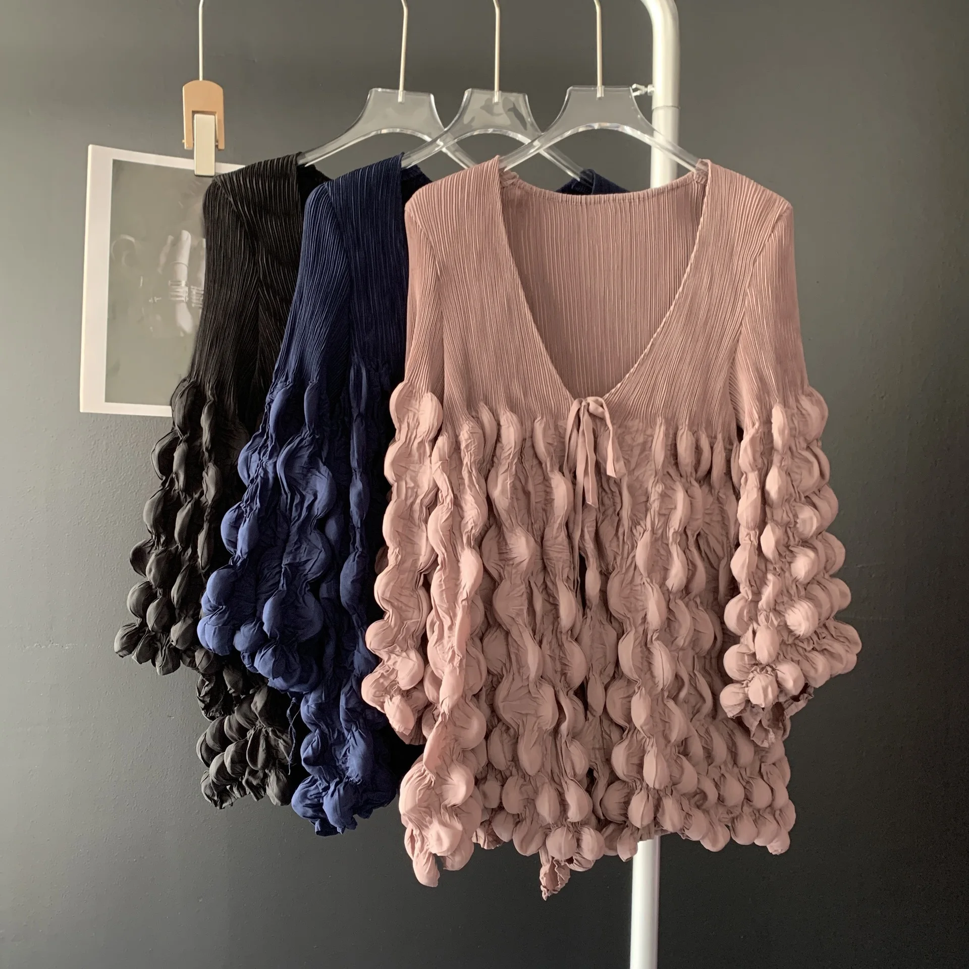 🍒Bubble sleeve pleated top with wrinkle tie strings top v neck design solid colour loose t-shirt smart casual clothes Bump Up Your Fashion
