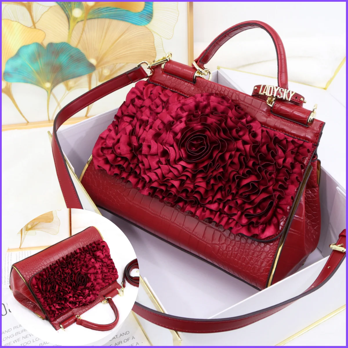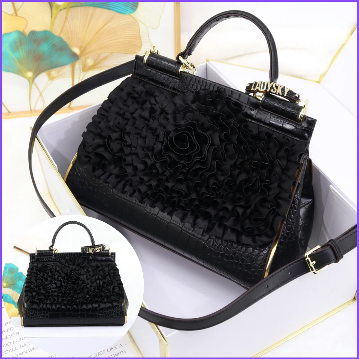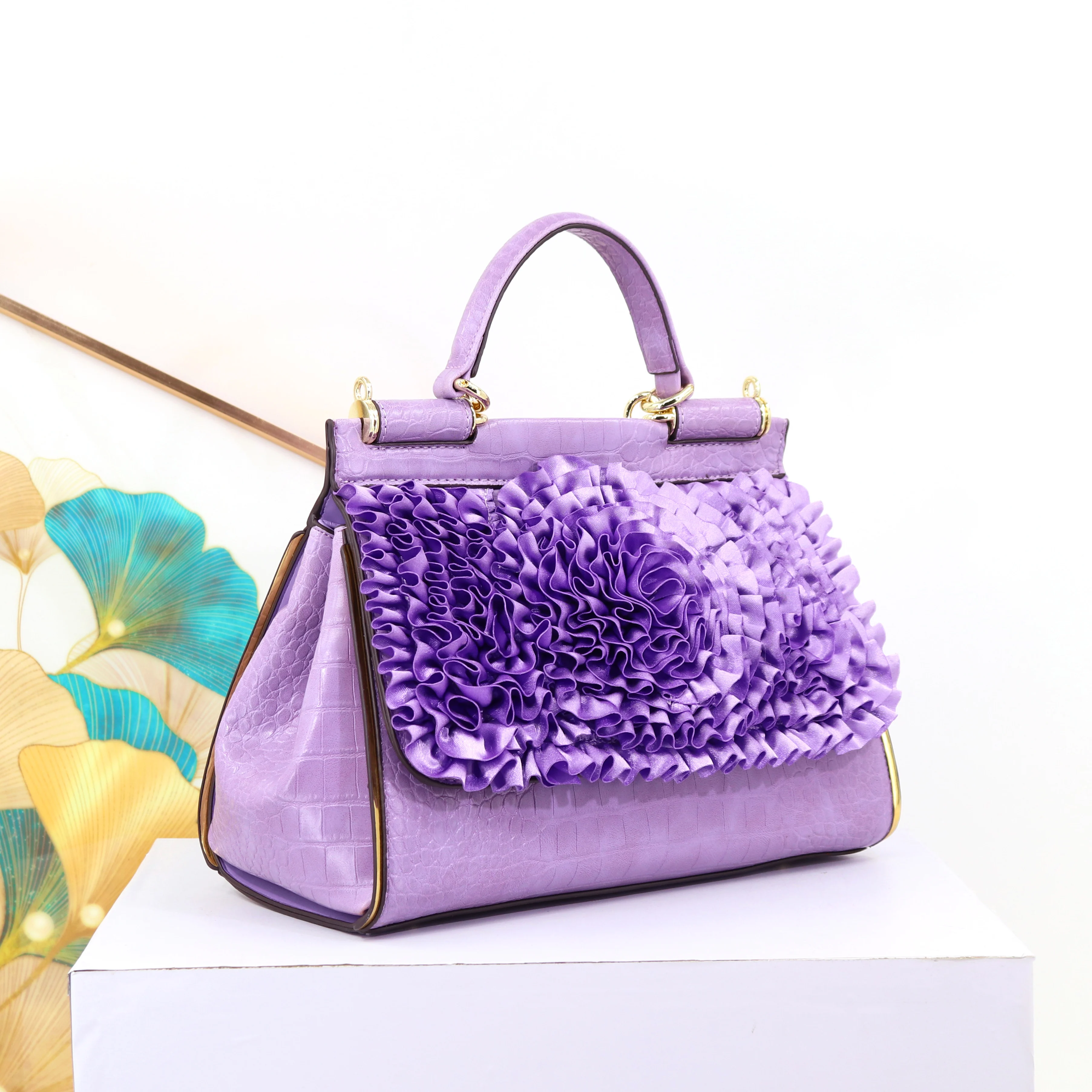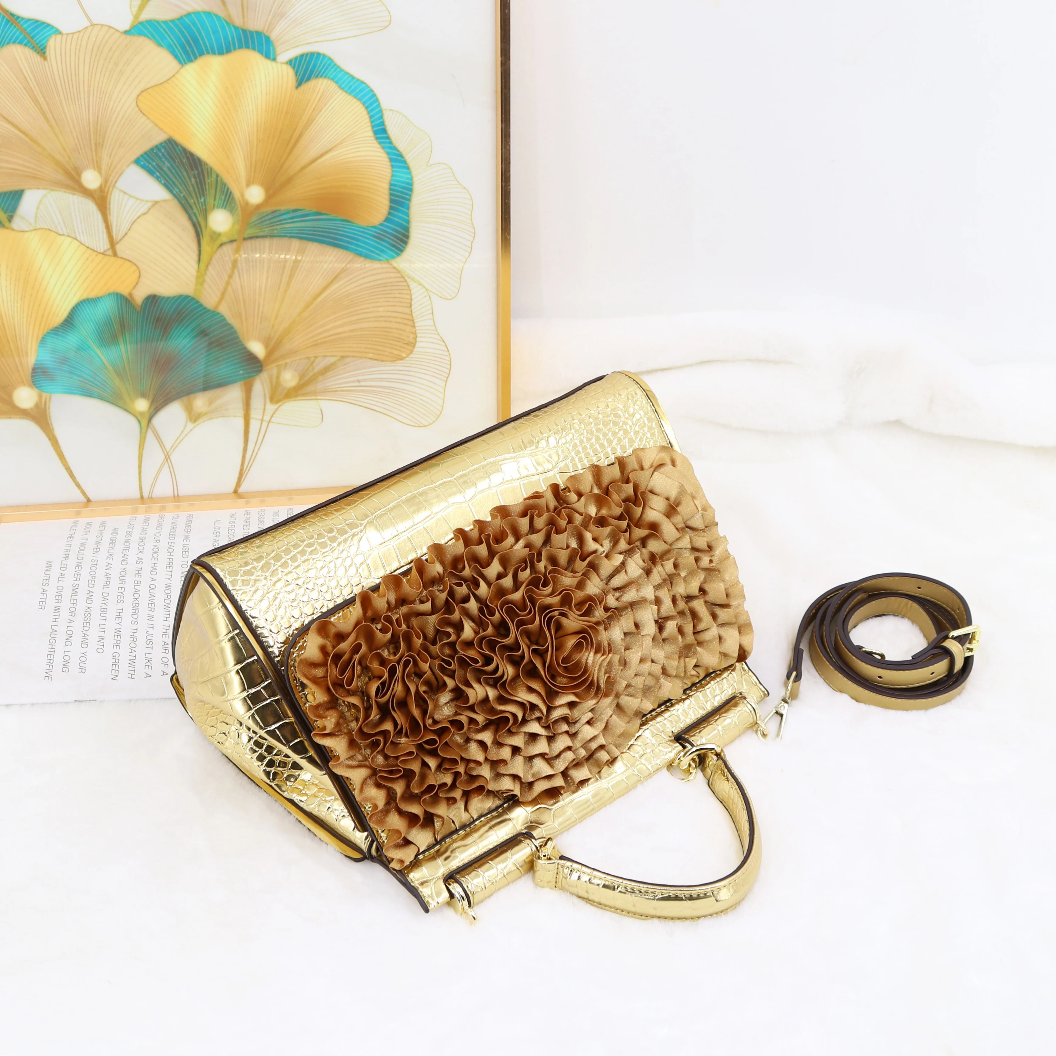 🍒3D foral handbag women fashion ladies bag luxury crossbody handbag crocodile elegant occasion accessory lotus leaf flower bag female bag with grab handle 30 cm Rose Gold
