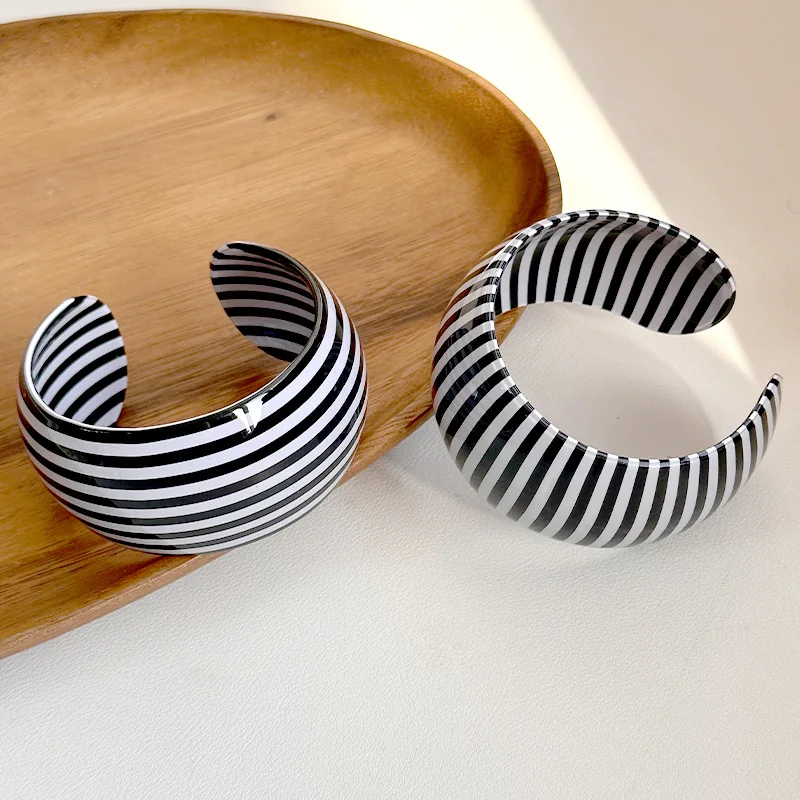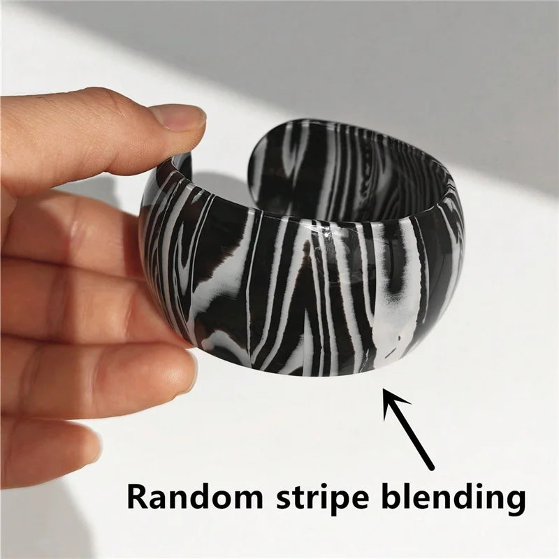 🍒Black and white striped wide bangle thick resin C shape open cuff bangle for women suitable holiday costume jewellery
