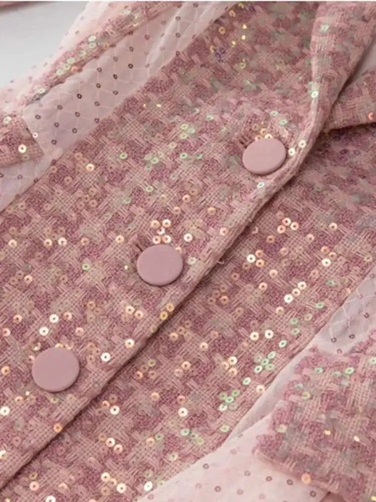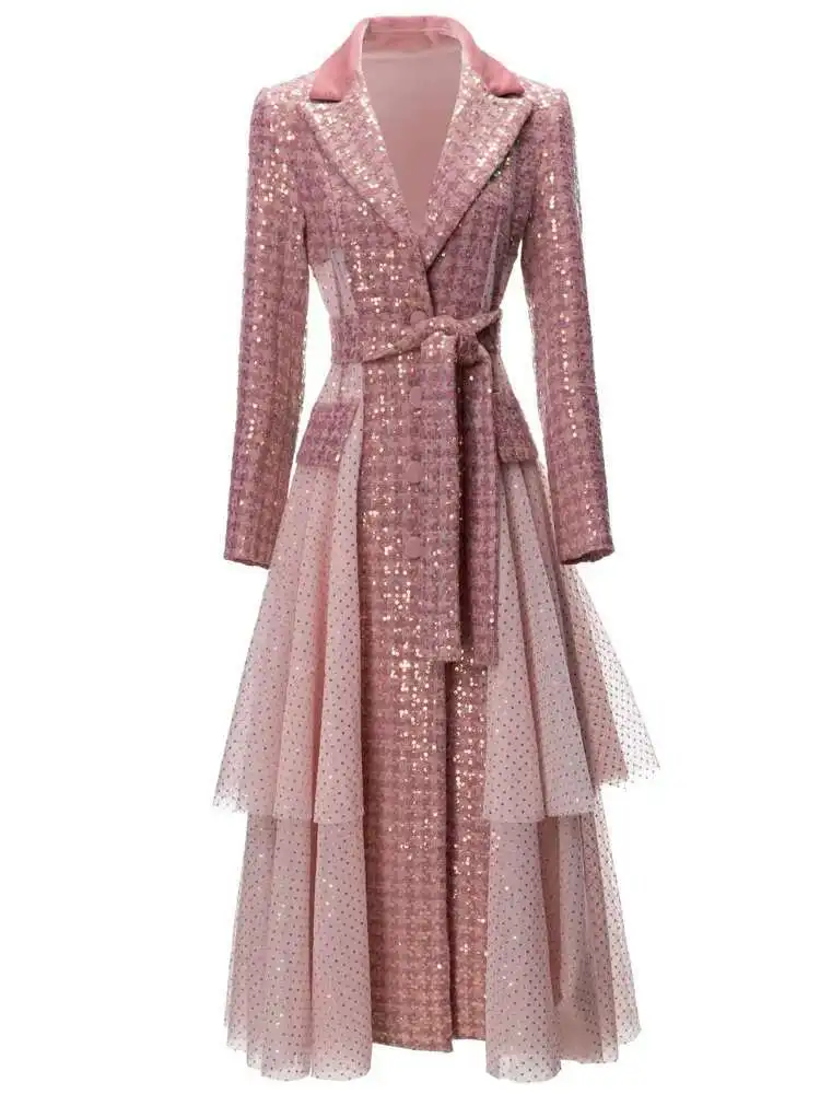🍒Sequin trench coat design with mesh long sleeve coat with belt for women special occasion outerwear with fitted waist single breasted fashion feminine outdoor clothing