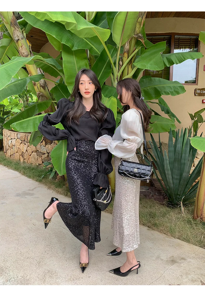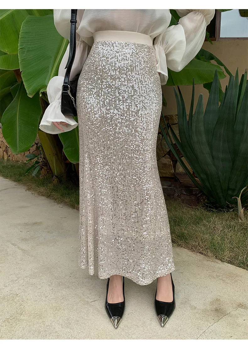 🍒Sequin maxi skirt summer elasticated waist skirts full length bodycon fashion clothing for women glitter party club wear for women