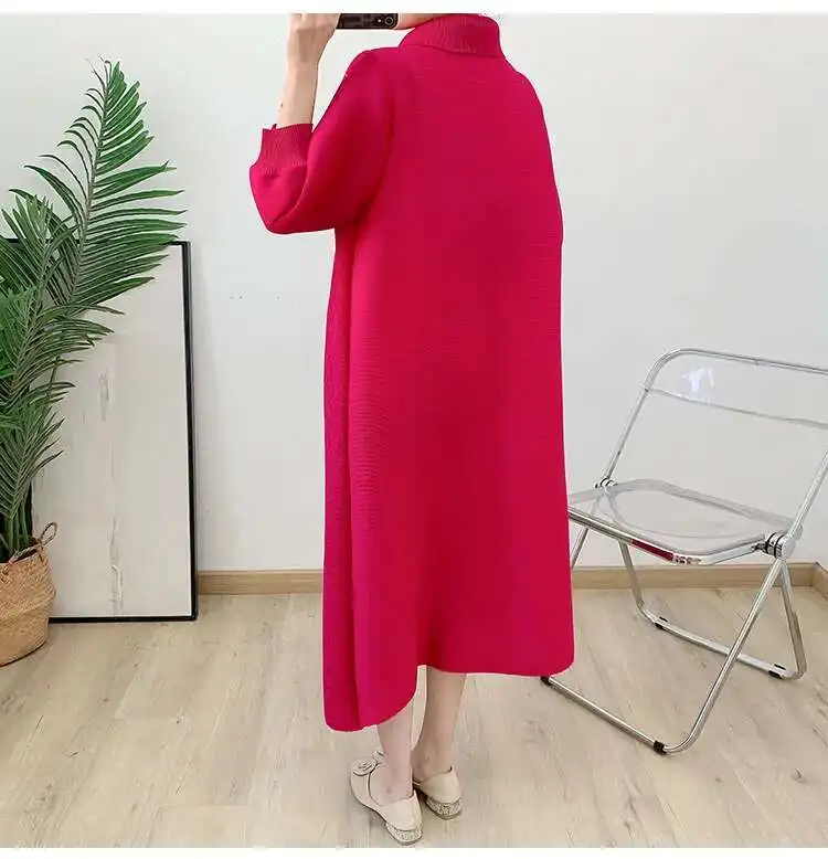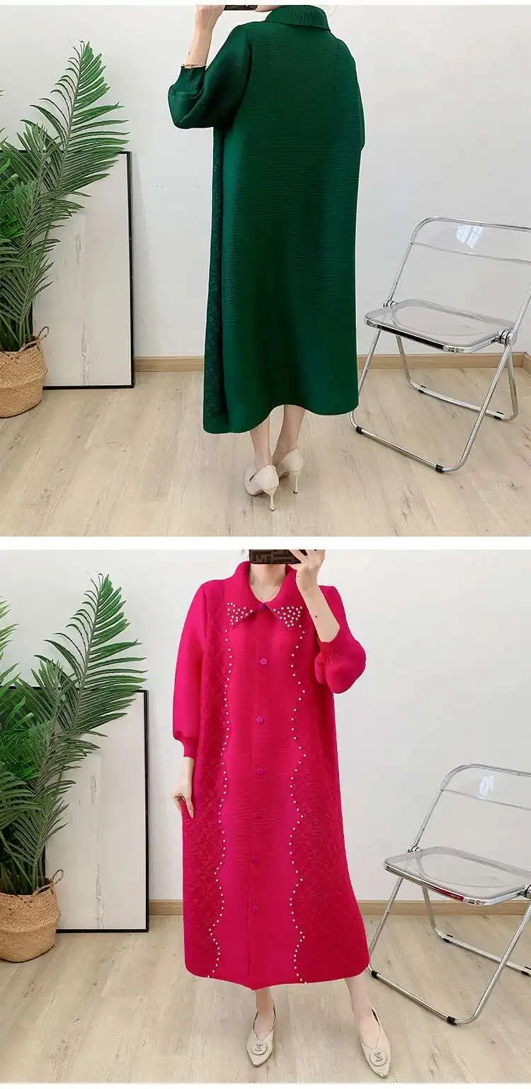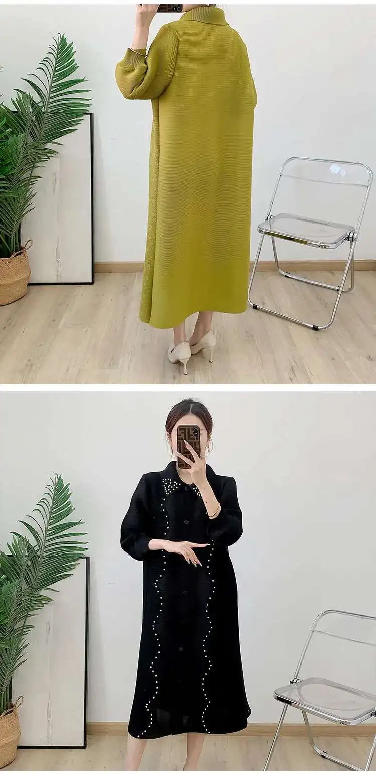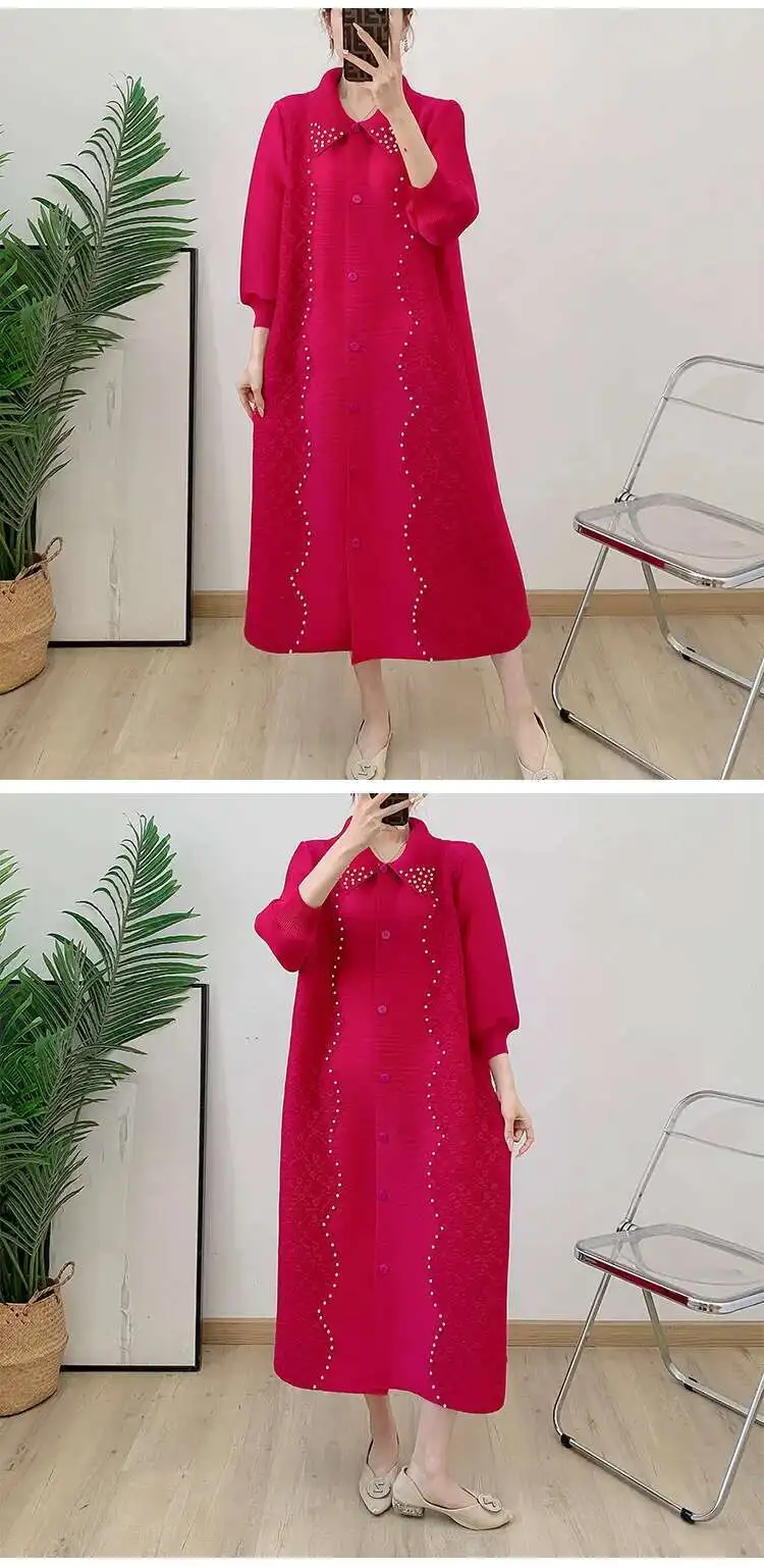 🍒Pleated dress for women spring high-end occasion wear lapel coat outfit loose beaded long sleeve maxi elastic female fashion 6R5109