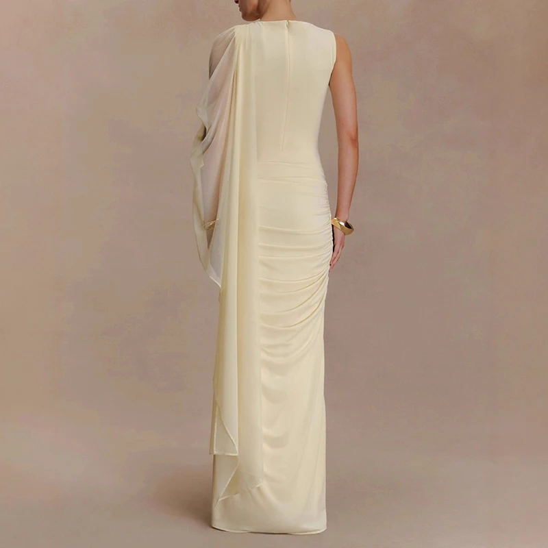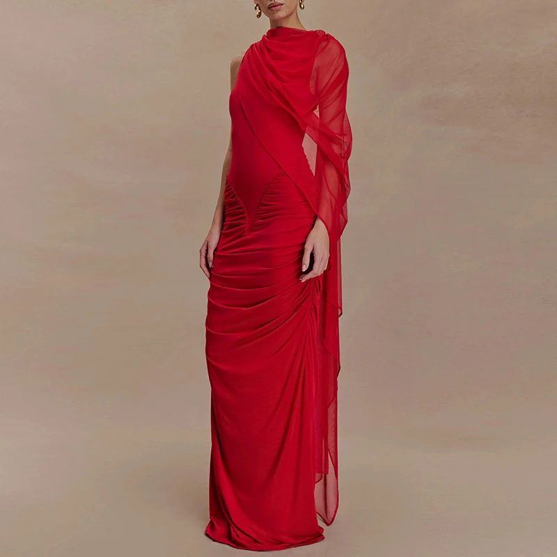 🍒Mesh draped dress solid color outfits o/neck high waist chiffon evening gowns occasion wear maxi shawl dress Rome-mantic