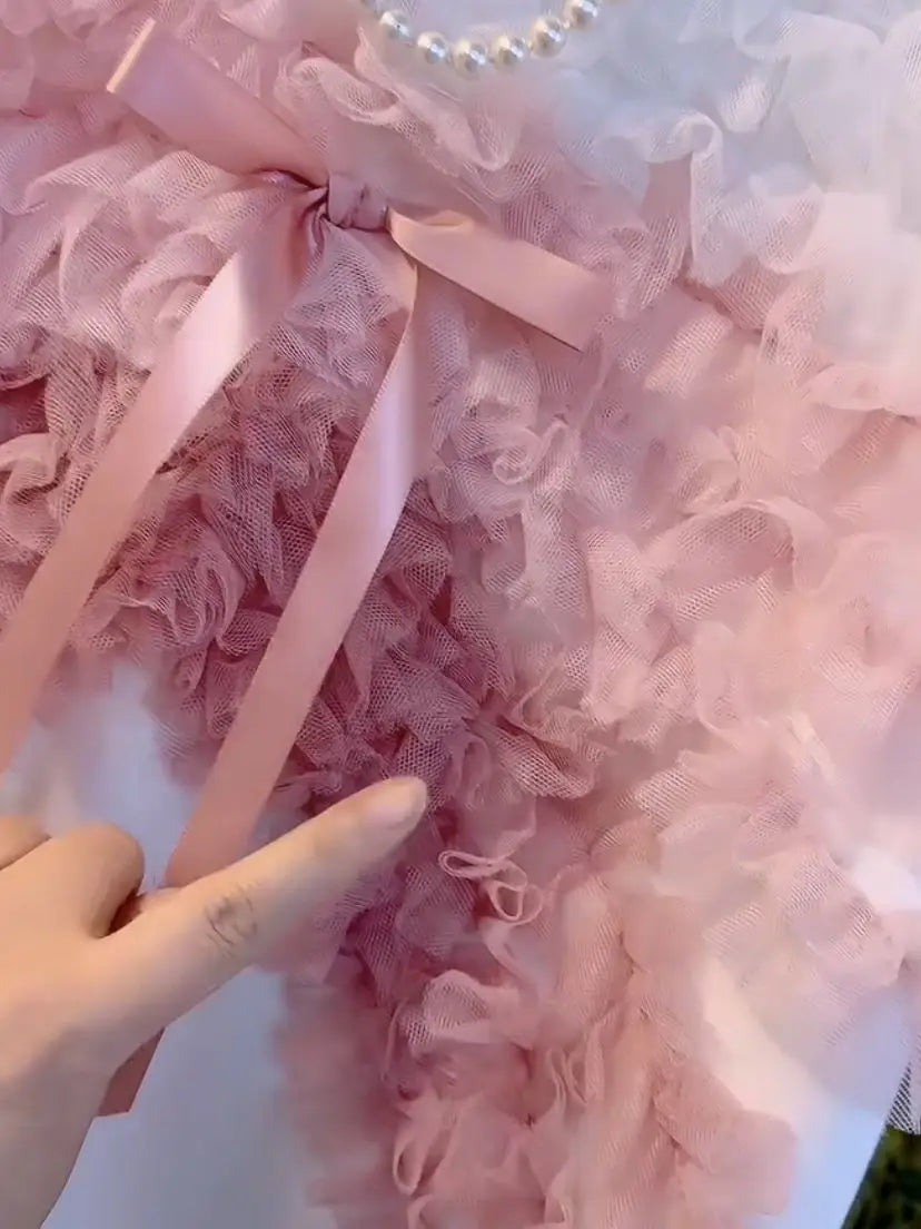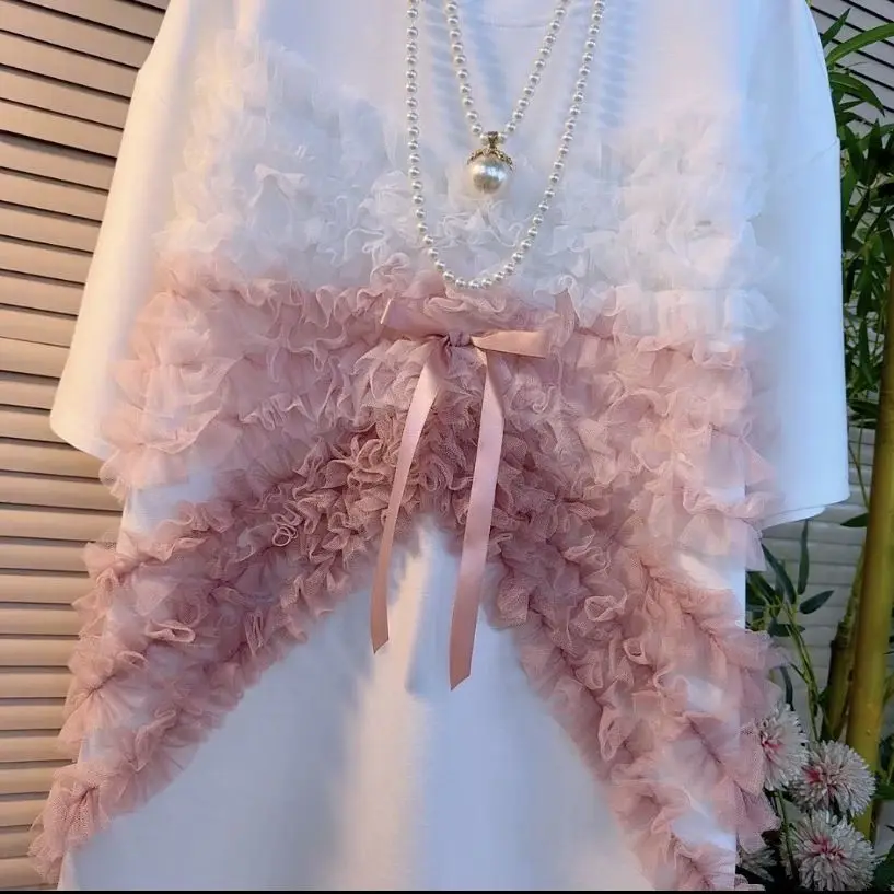 🍒Mesh lace ruffle tee shirt women 3d bow loose summer wear tops for girls mid length ruched chiffon t-shirt short sleeve Perfect Partying Pink
