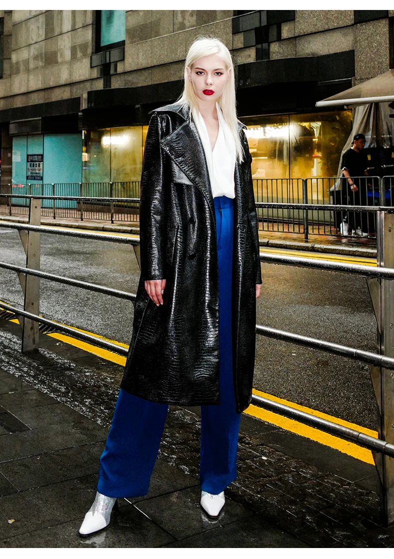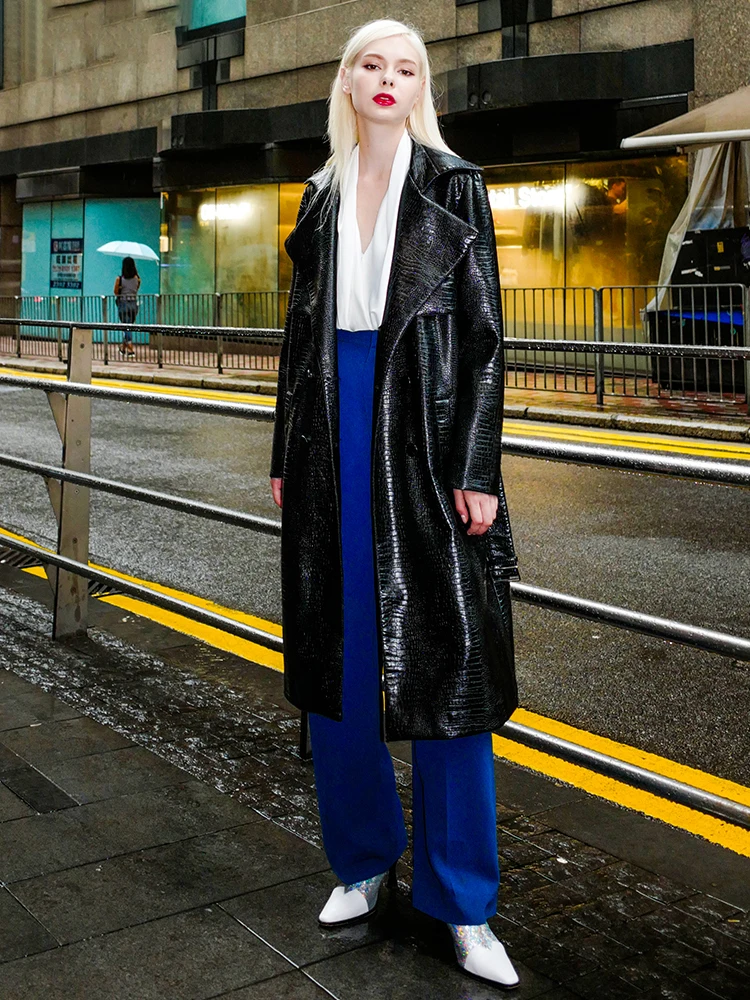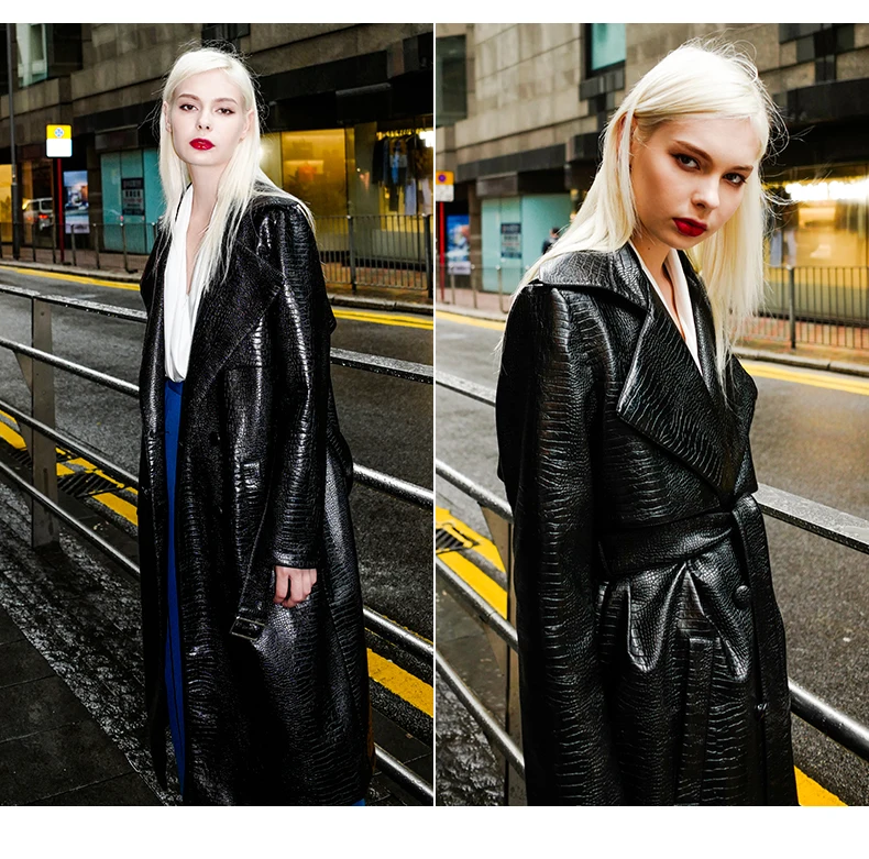 🍒Black crocodile trench coat patent faux leather coat long black for women long sleeve belt fall red leather clothes women