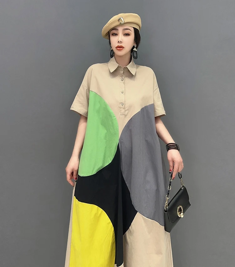 New Korean Style Unique Wear Loose Fit Tide Woman Summer Black Patchwork Shirt Dress Girls Casual Large Dresses Robe JJXD711