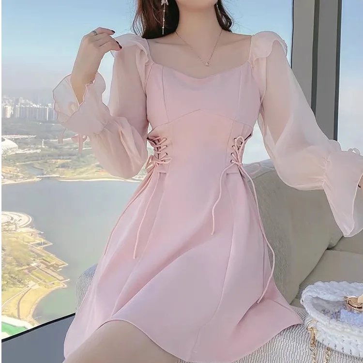 🍒Pink dresses women spring summer sweet heart neckline outfit a-line mini dress with puff sleeves lace up draw string sides waist feminine fashion A- Pretty Pink