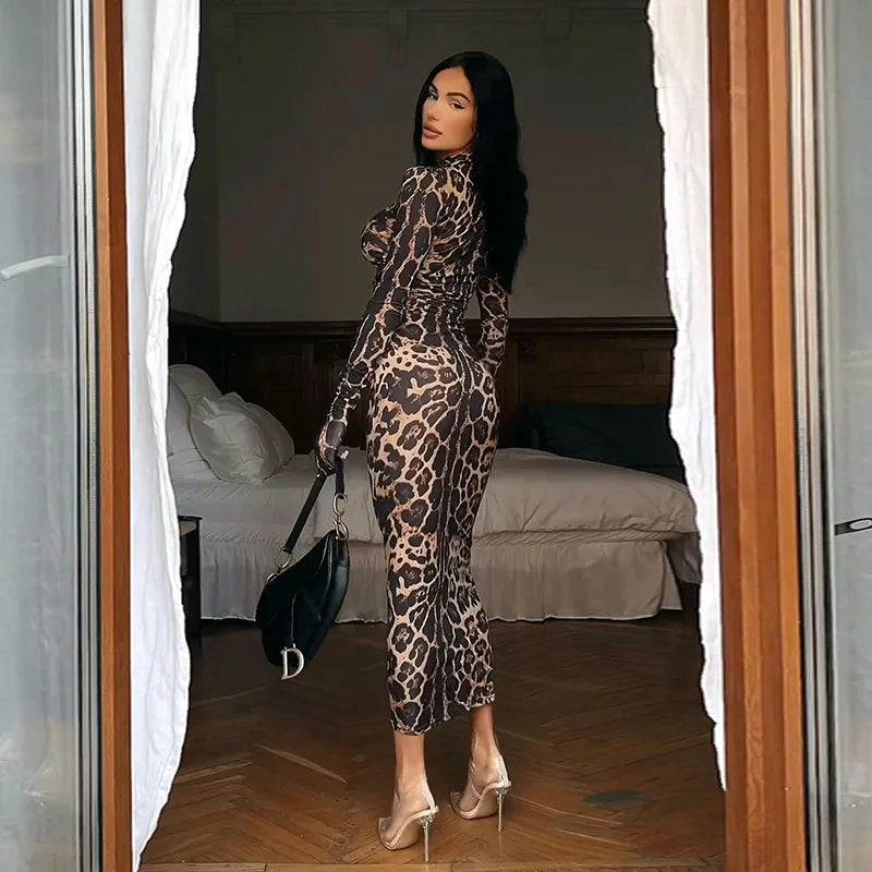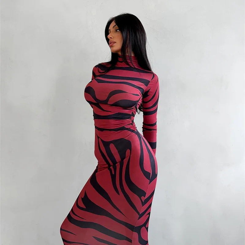 🍒Red striped long dress womens bodycon turtle neck zebra print mesh outfit clubwear party occasion wear clothing Catwalk Your Tiger