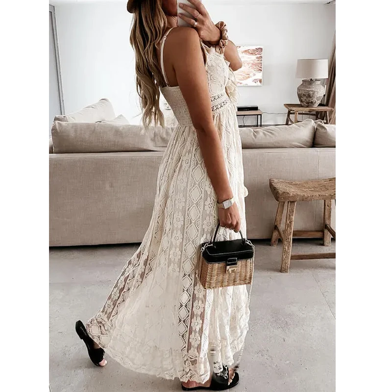 🍒Sleeveless lace dress spaghetti straps camisole long mesh outfit v-neck loose summer fashion for women tassel loose beach wear for women solid colour holiday wear Do A Spot Of Sunbathing In Beachy Lace