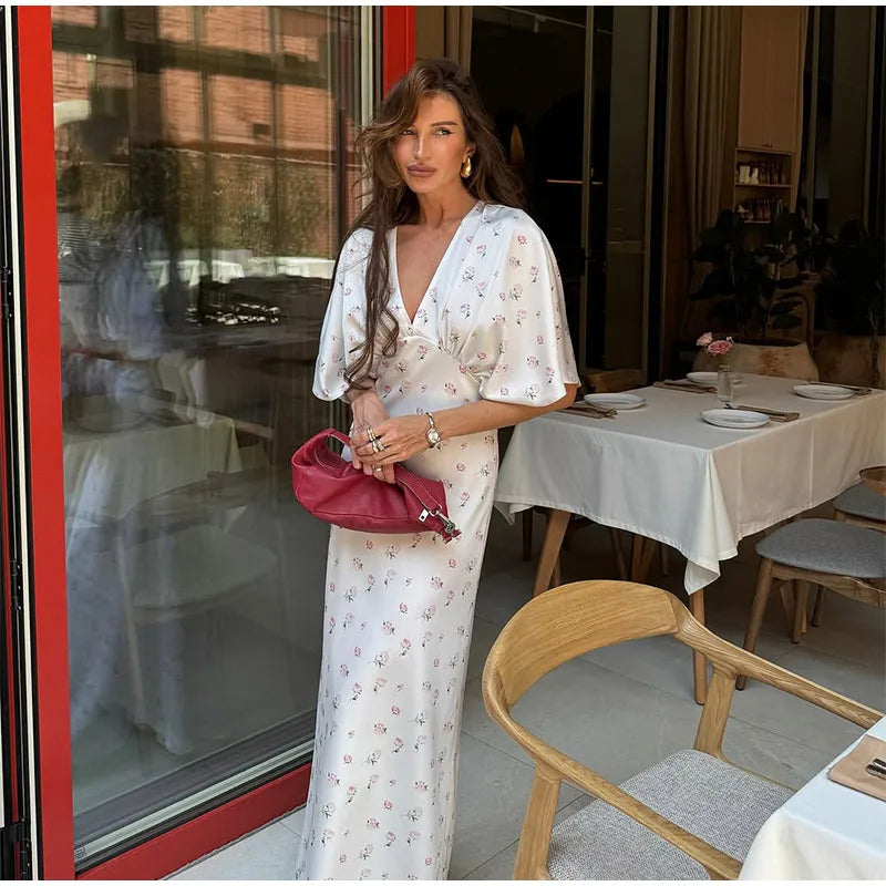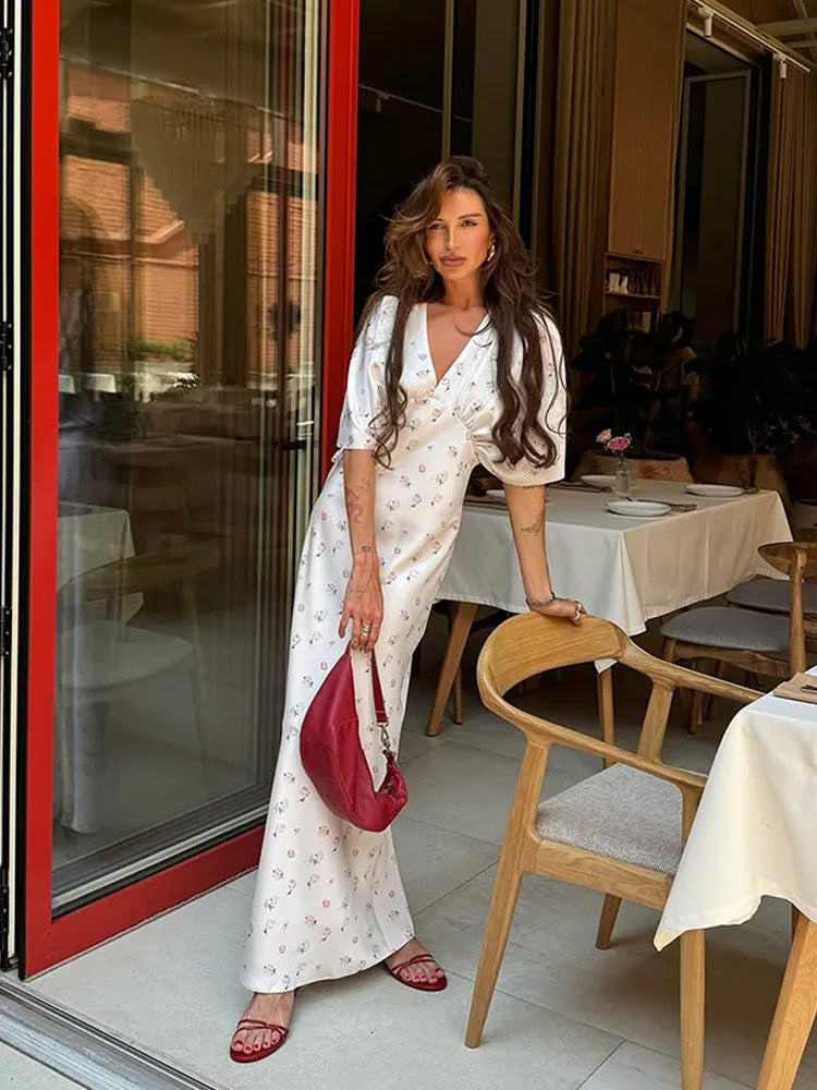 🍒Summer printed v-neck dress with flower print womens fashion slim fit waist short butterfly sleeve long summer outfit with short sleeves high waist office wear cute comfy casu classy