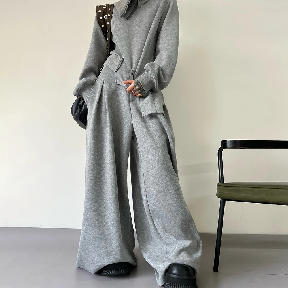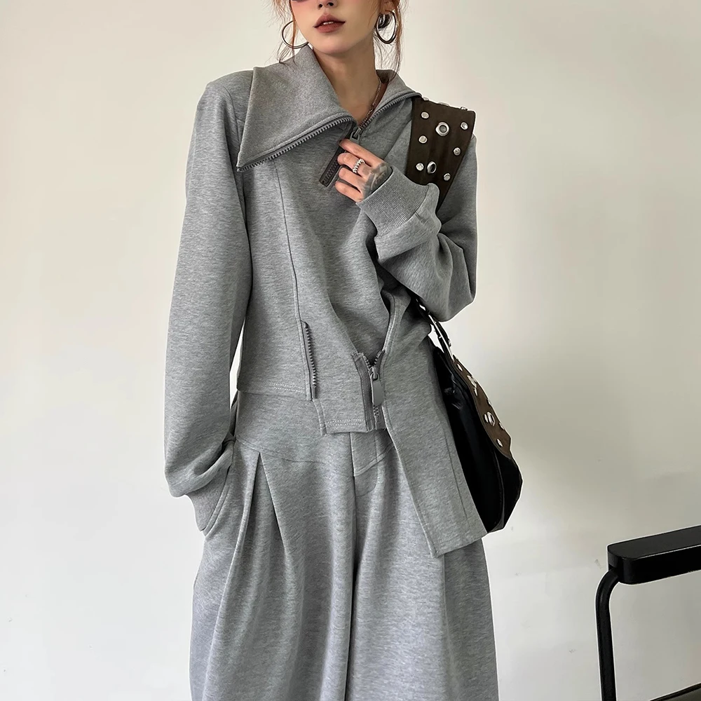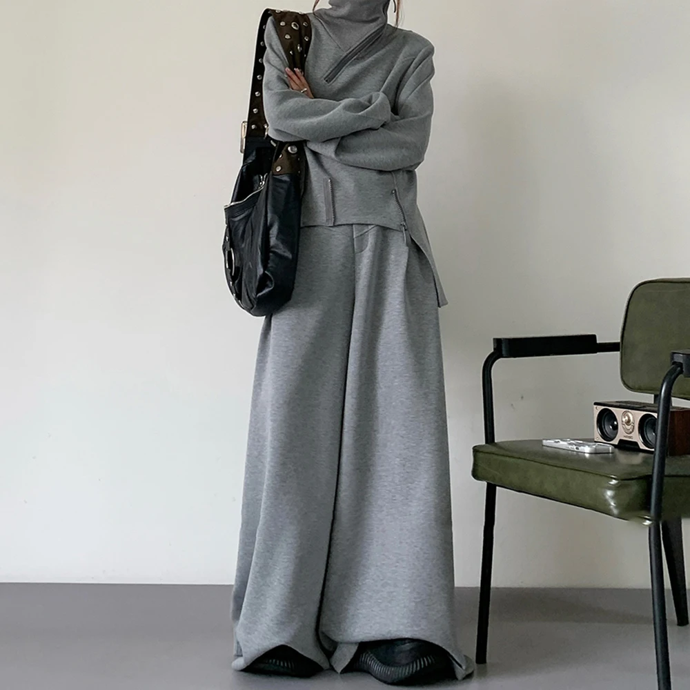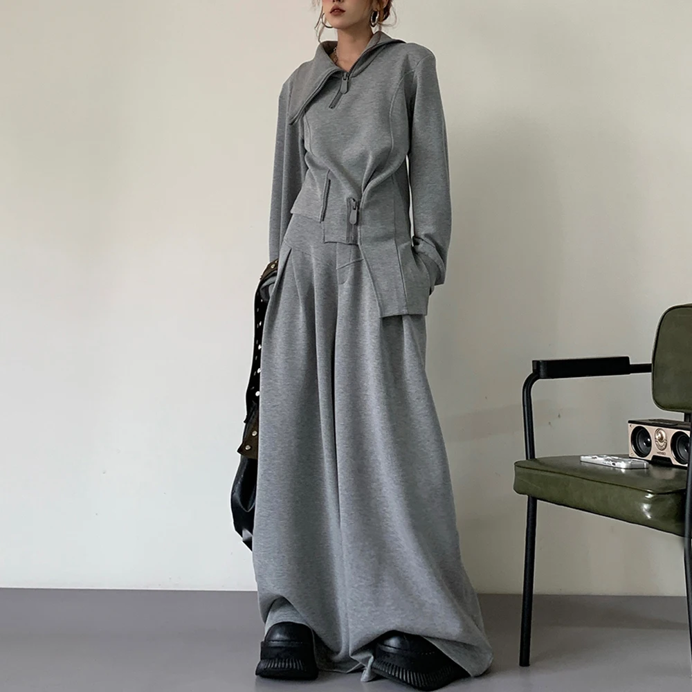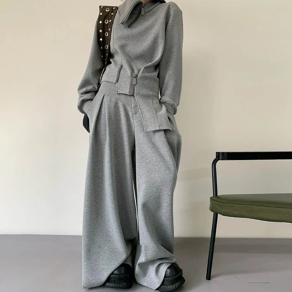 🍒 Solid two piece set smart casual clothing for women cool chic high neck jacket long sleeve zipper top and high waist wide leg pants set female fashion wears Fun Fashion flares