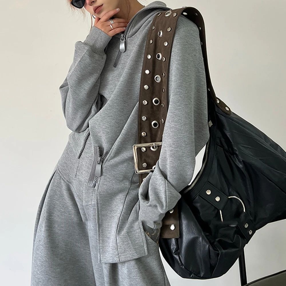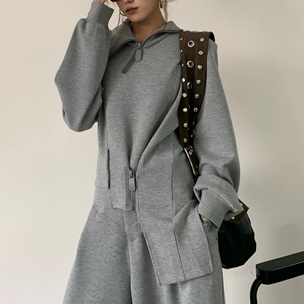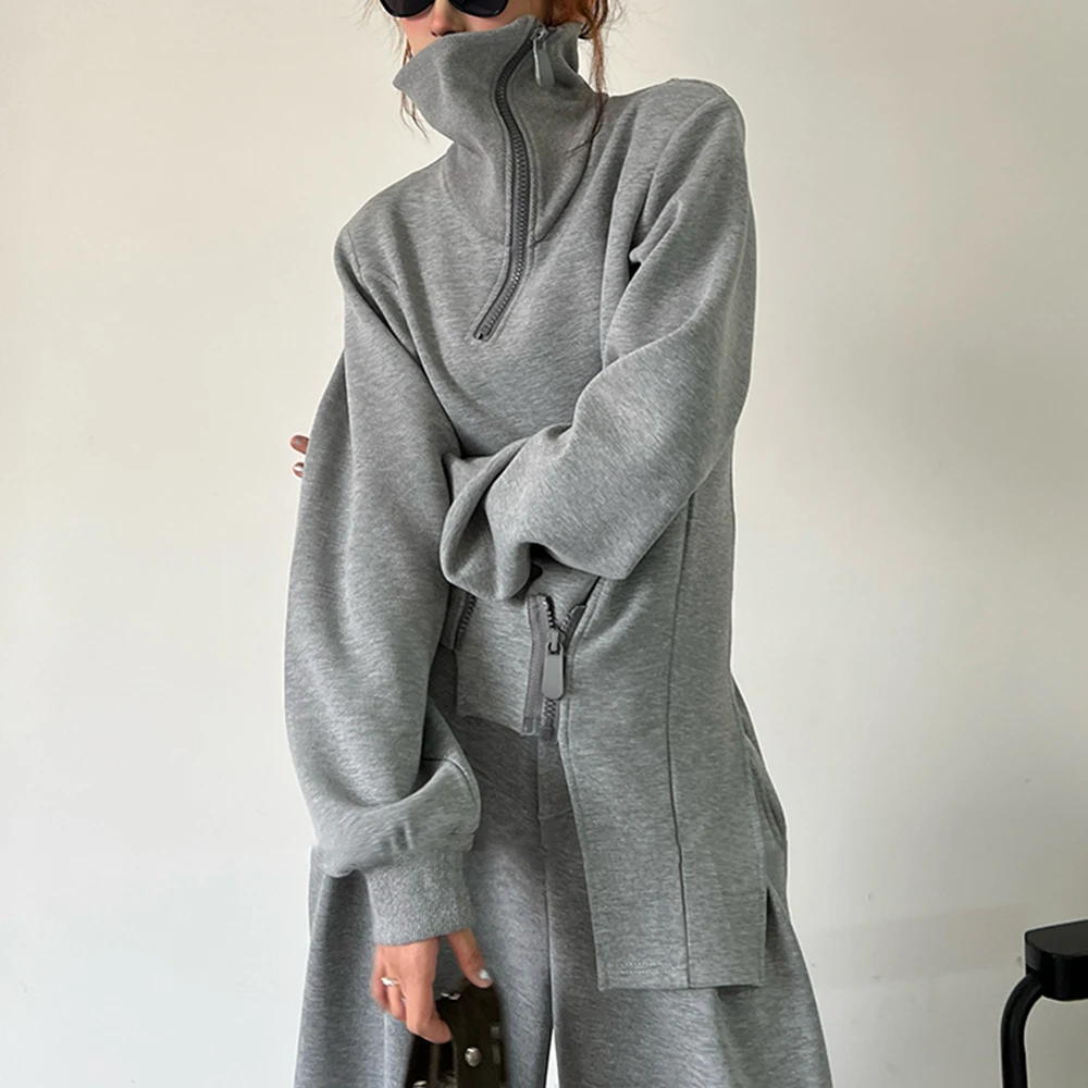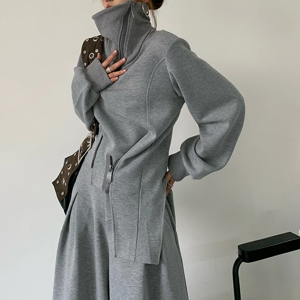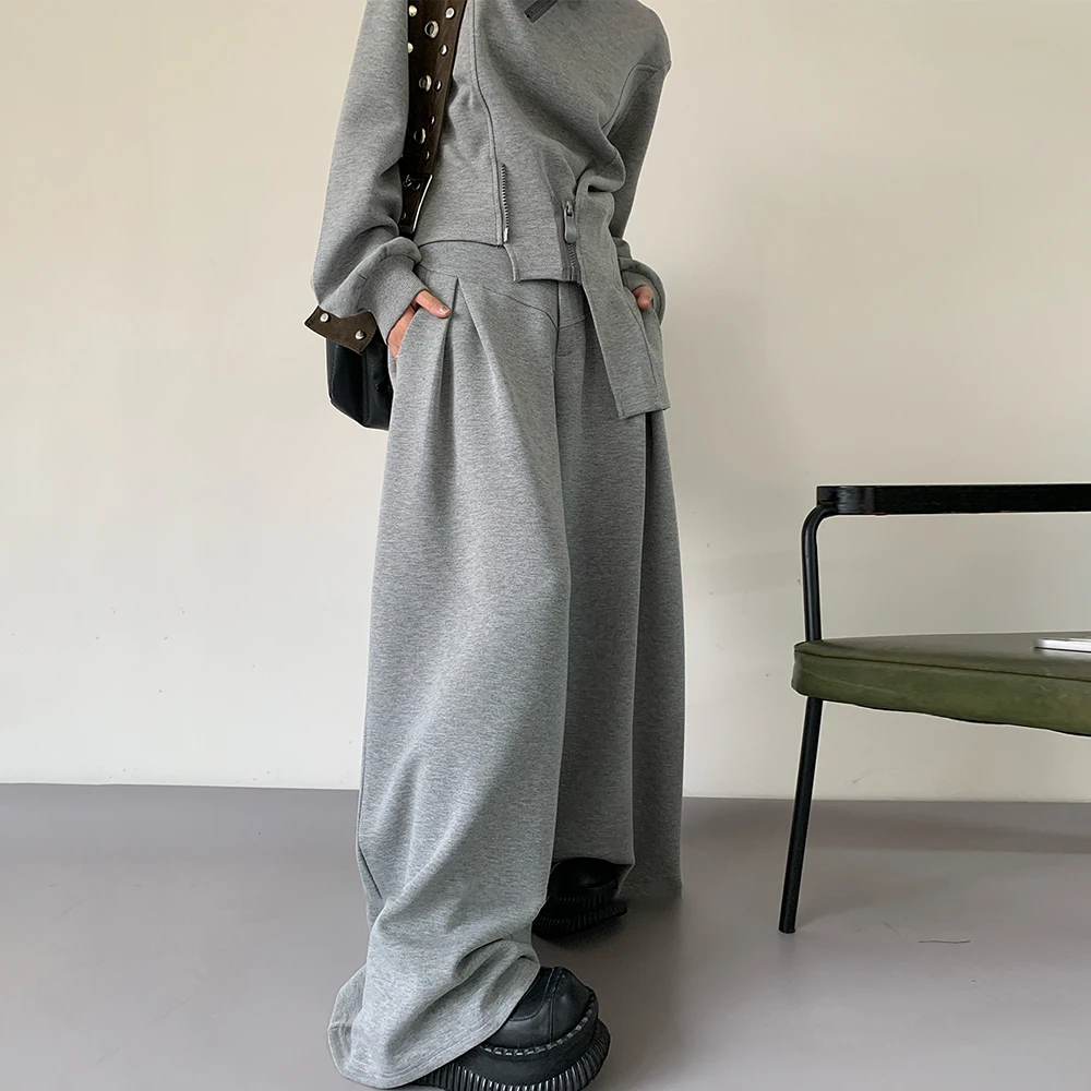🍒 Solid two piece set smart casual clothing for women cool chic high neck jacket long sleeve zipper top and high waist wide leg pants set female fashion wears Fun Fashion flares