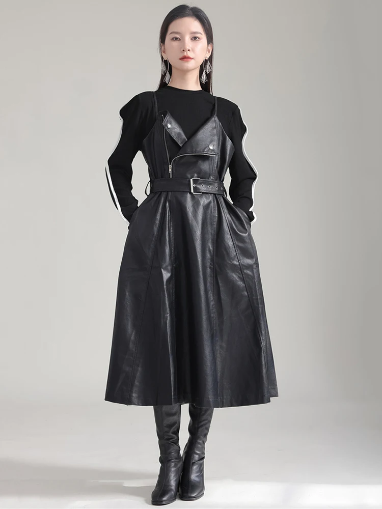 🍒Black faux leather dress spaghetti strap pu outfit with zip front sleeveless belted midi a-line dress party occasion wear sleeveless wear for women Like A Biker