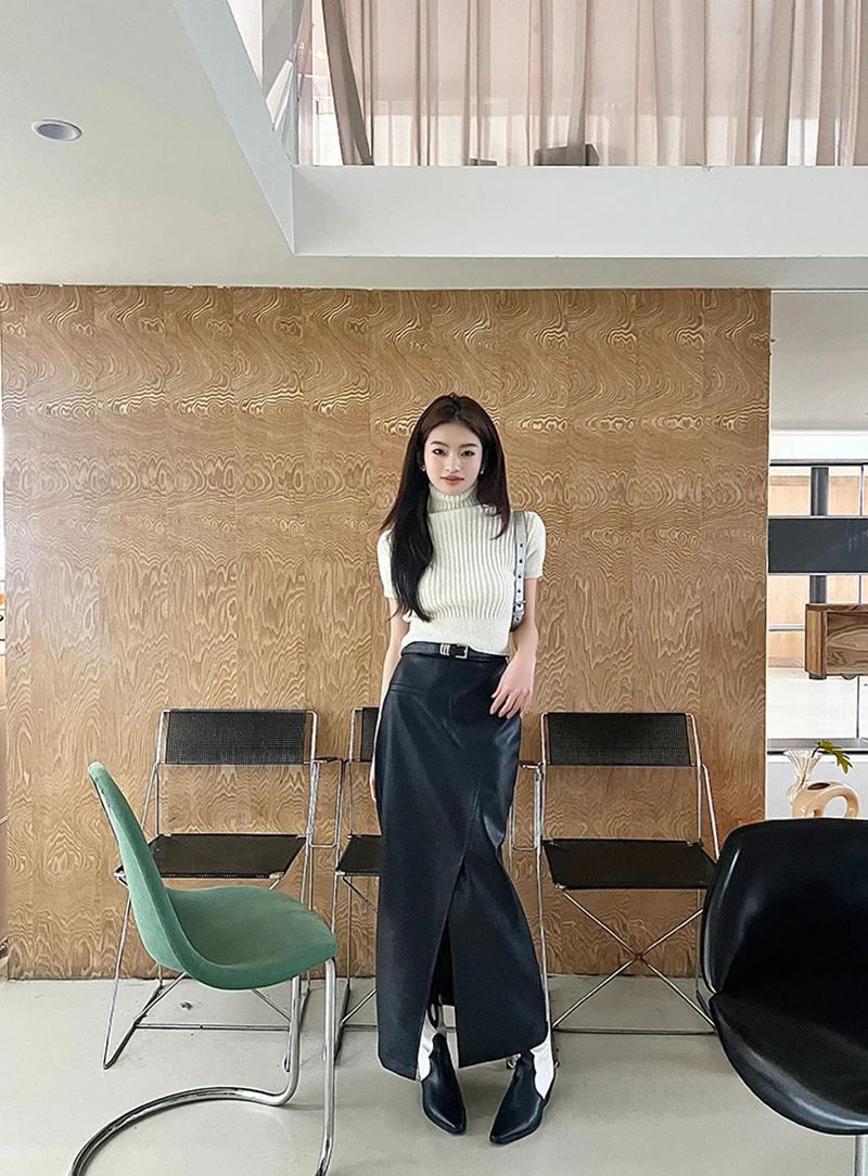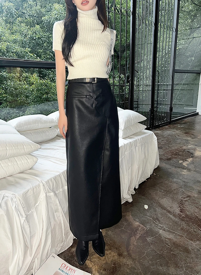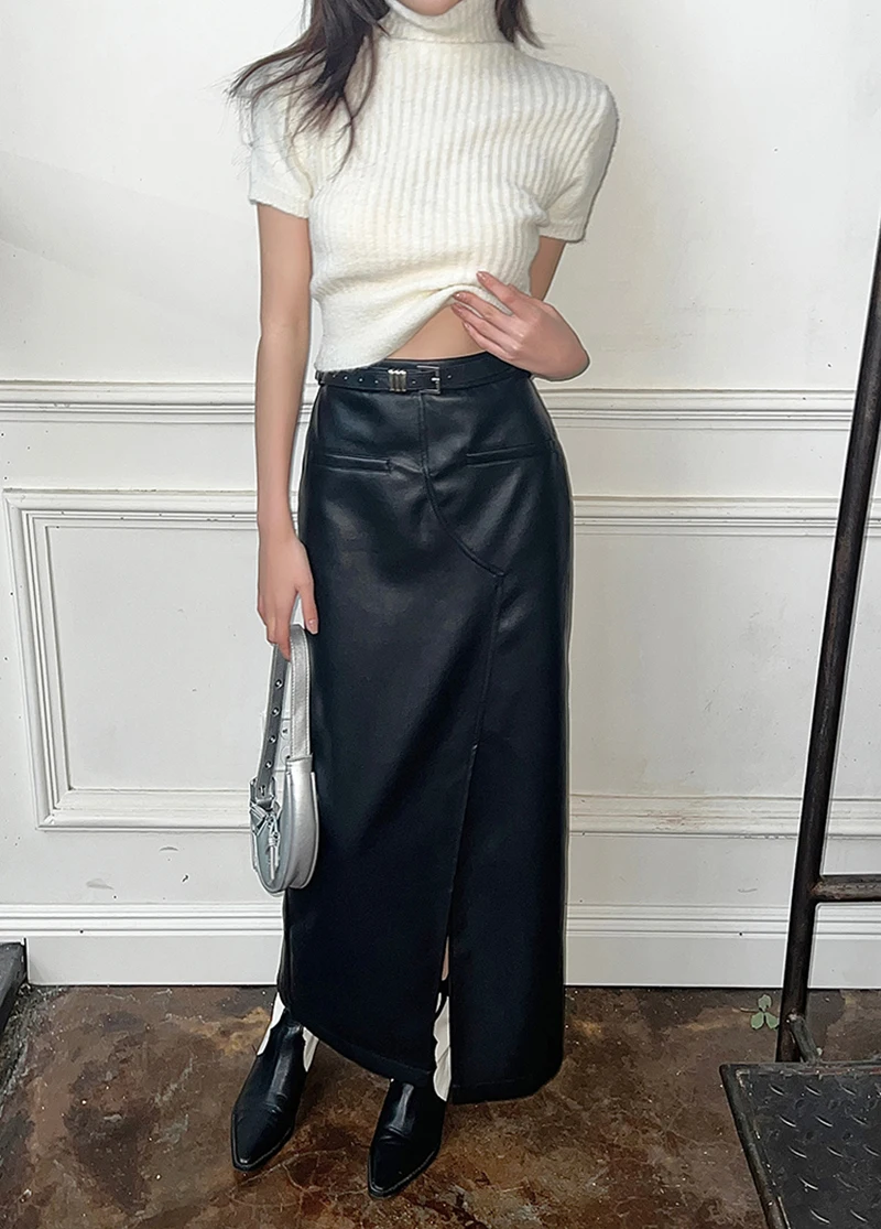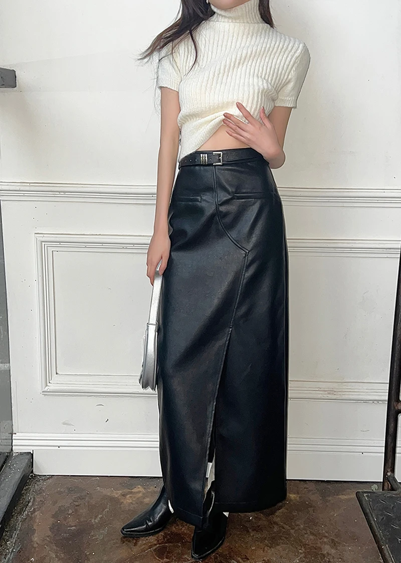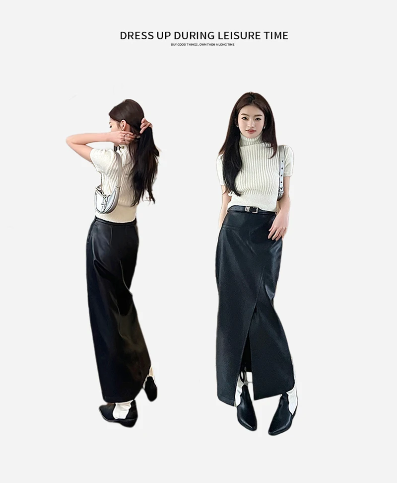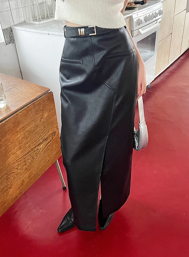 🍒Vintage faux leather skirt for women high waisted black maxi skirt with slits Y2K fashion split slim a-line Dont Slip Up On Style Get This Split Slim Slick