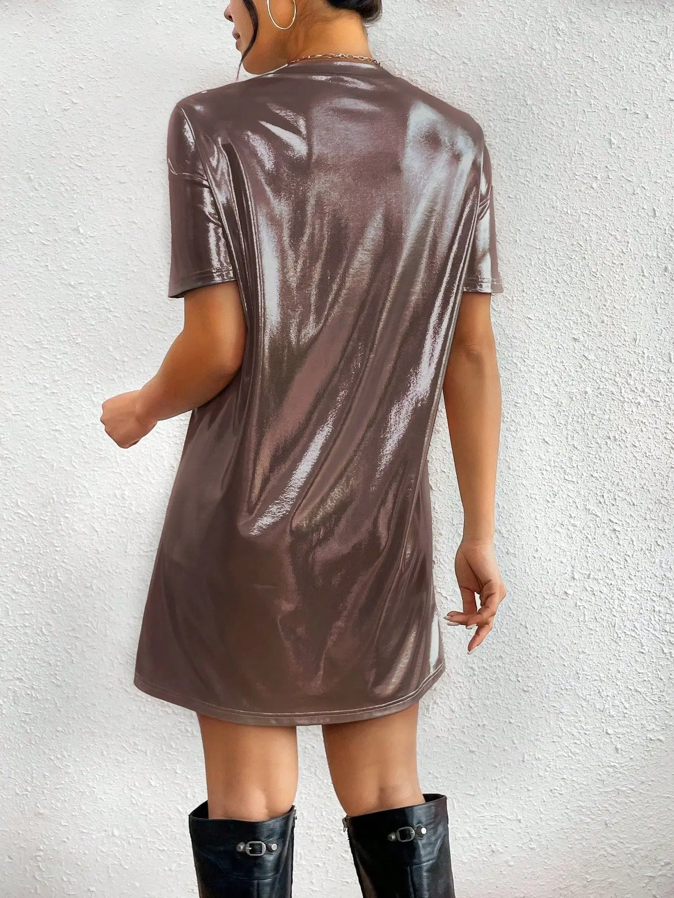 🍒Shiny t-shirt dress trendy o-neck outfit short-sleeved mini dress loose tee club wear party wear holiday wear beach party clothes Save Your Silvers keep Your Coppers
