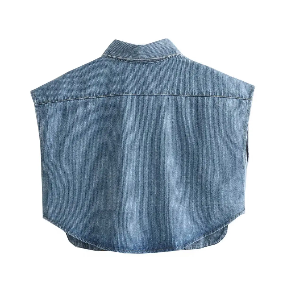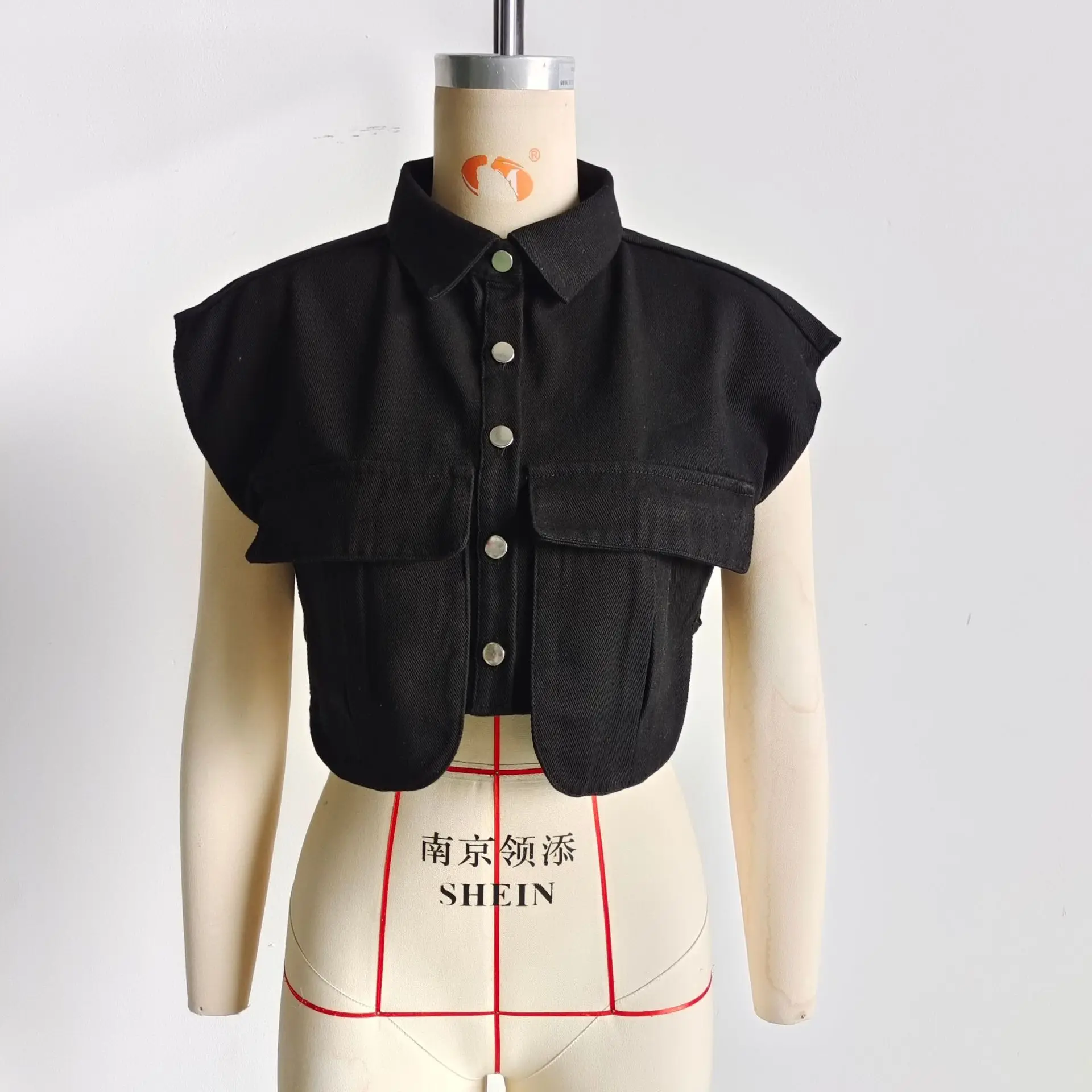 🍒Women's summer cropped shirt sleeveless blouse top ladies elegant with large pockets vintage style chic casual solid summer clothing high end cardigan denim top Pocket This Crop